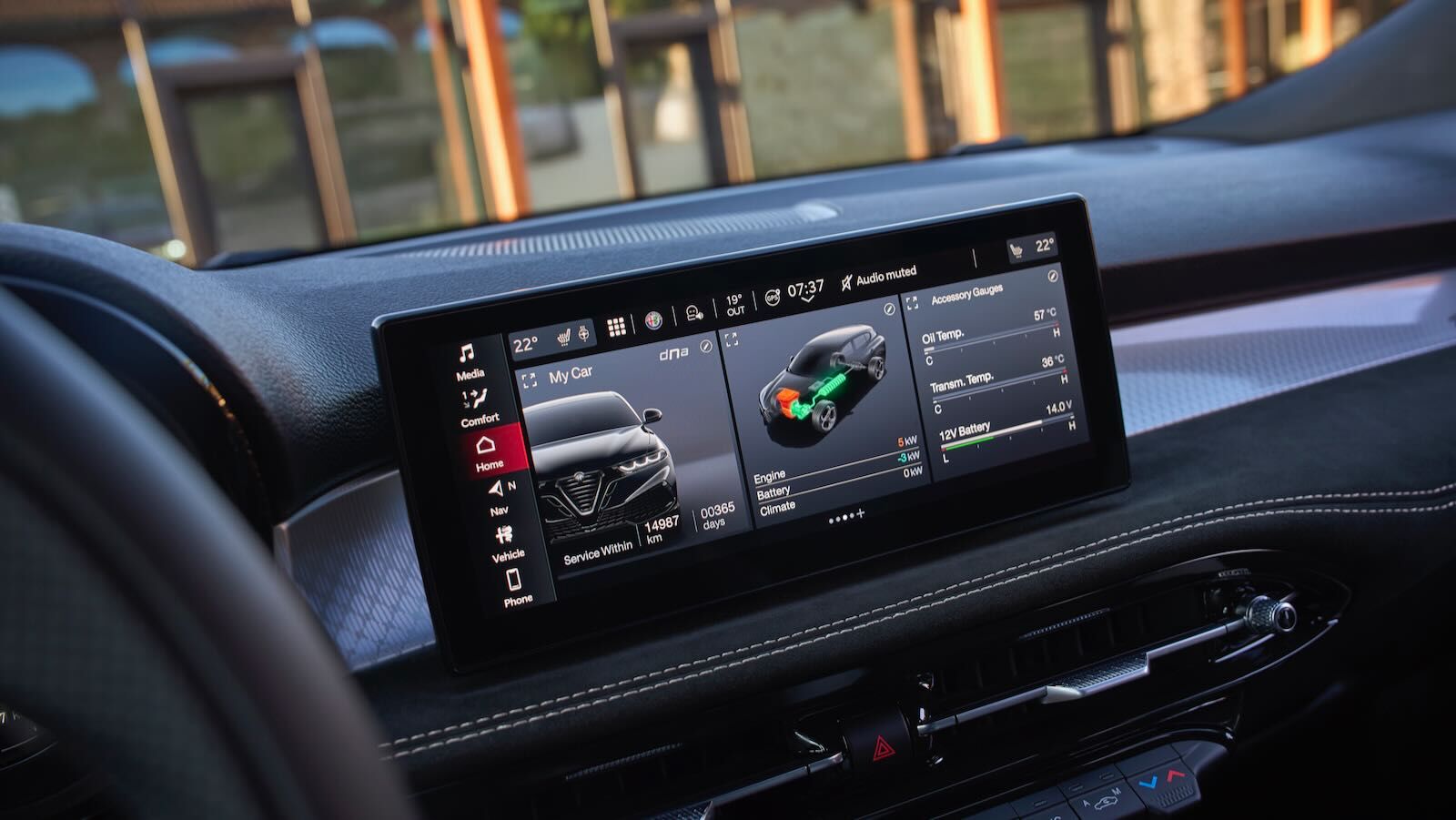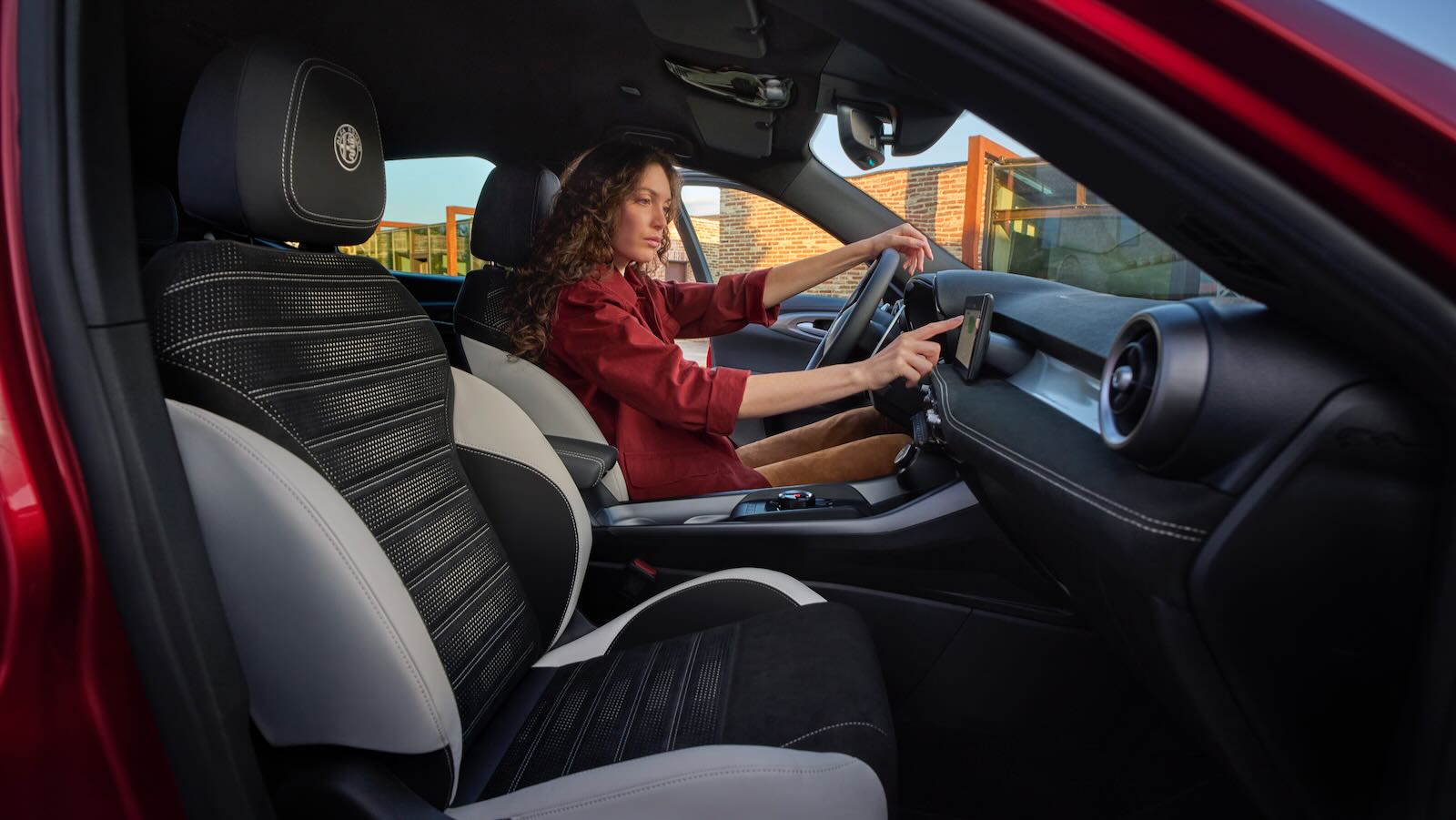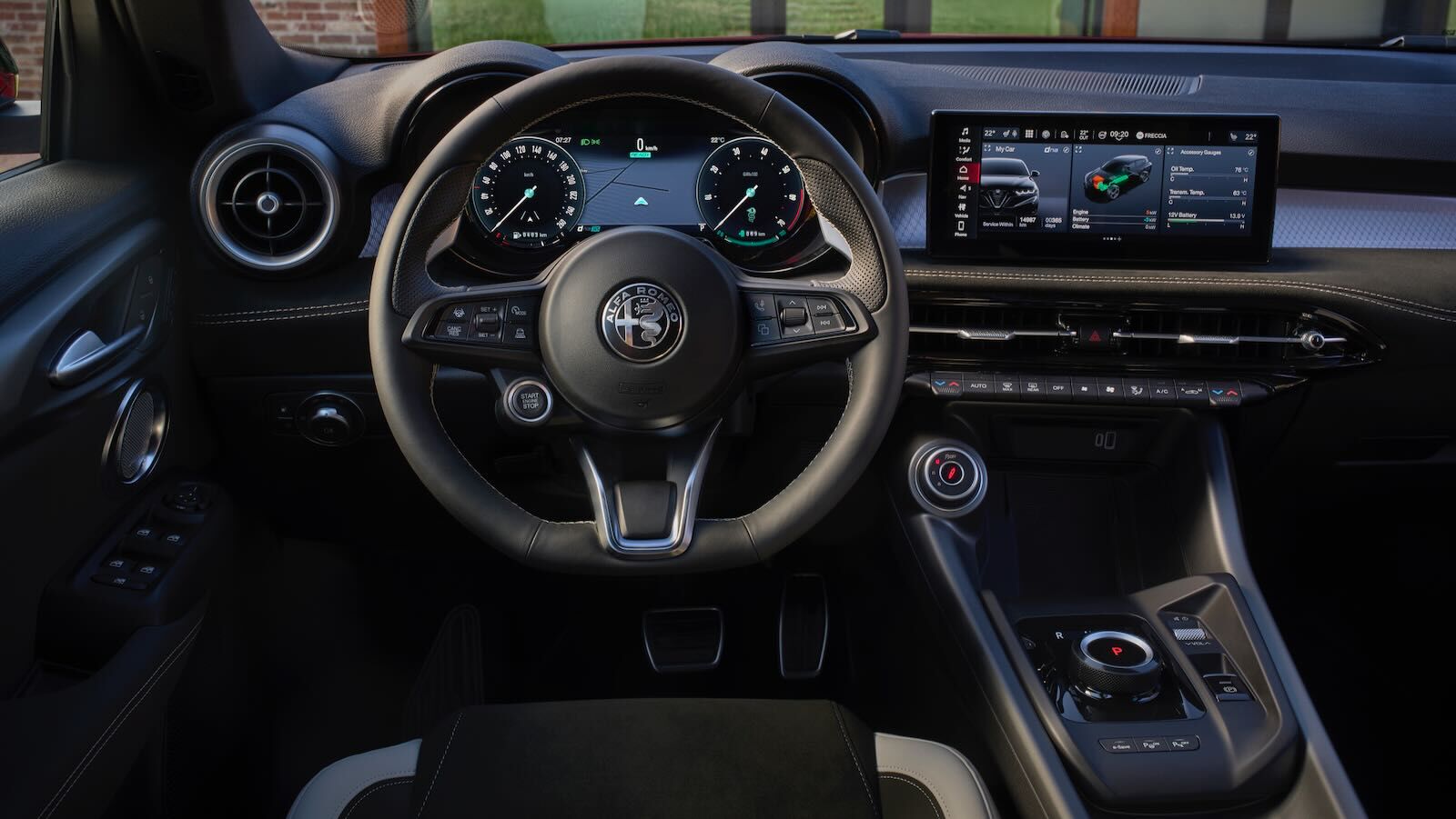 En la versión Sport Speciale, un sistema de iluminación ambiental con efecto degradado reproduce la textura del Biscione (serpiente del emblema de la marca), combinando estética y vanguardia. El puesto de conducción se centra en una doble pantalla de 12,3 pulgadas (la instrumentación digital tipo telescope) y otra de 10,25 pulgadas para el sistema multimedia Alfa Connect, compatible con actualizaciones OTA, conexiones Apple CarPlay y Android Auto inalámbricas y servicios conectados.
