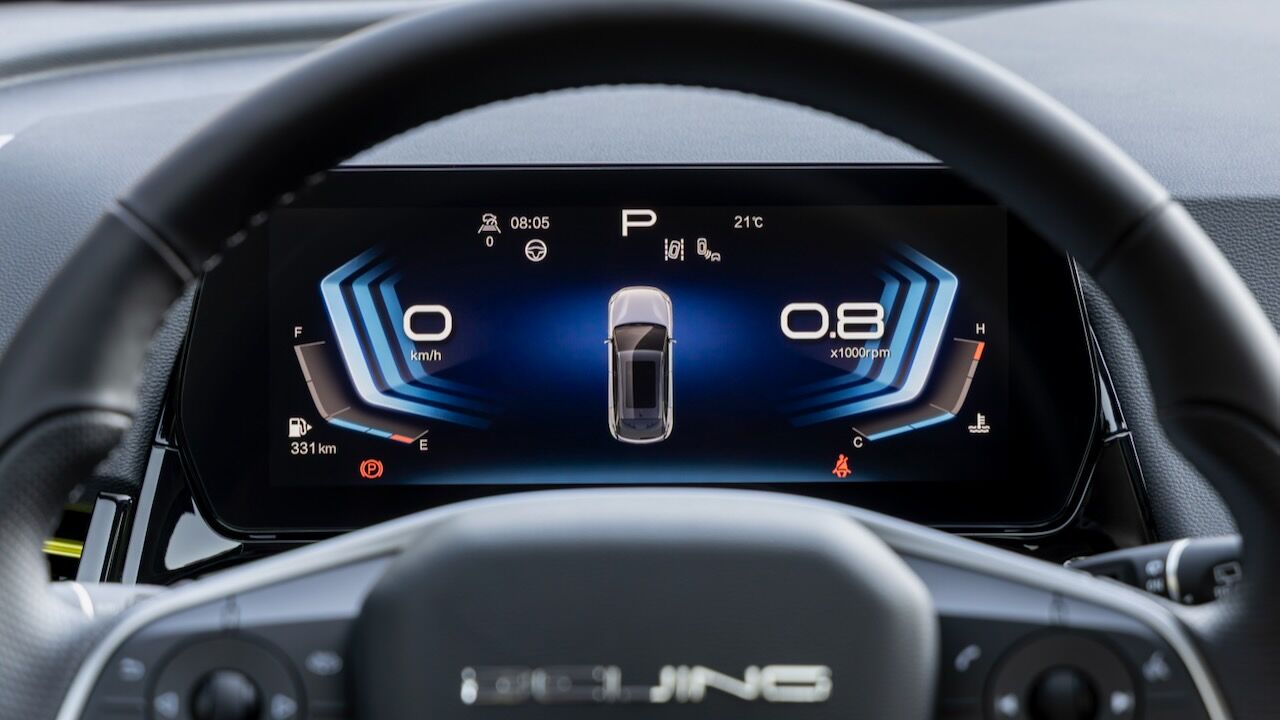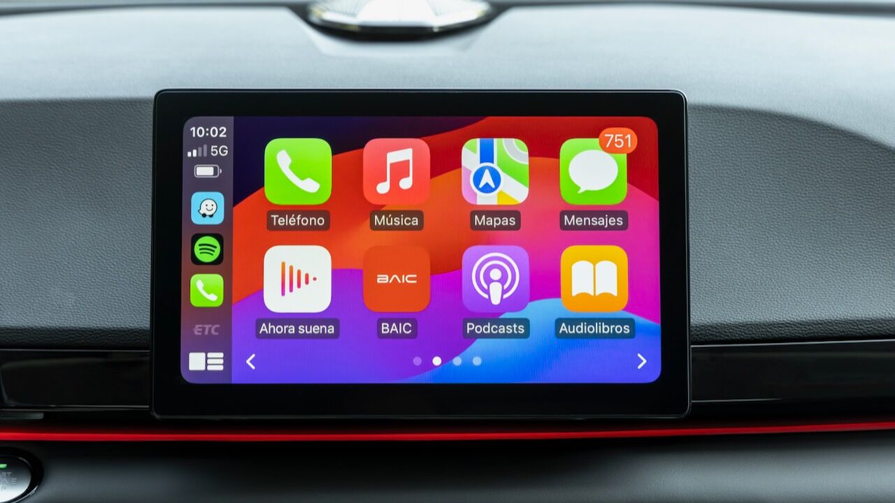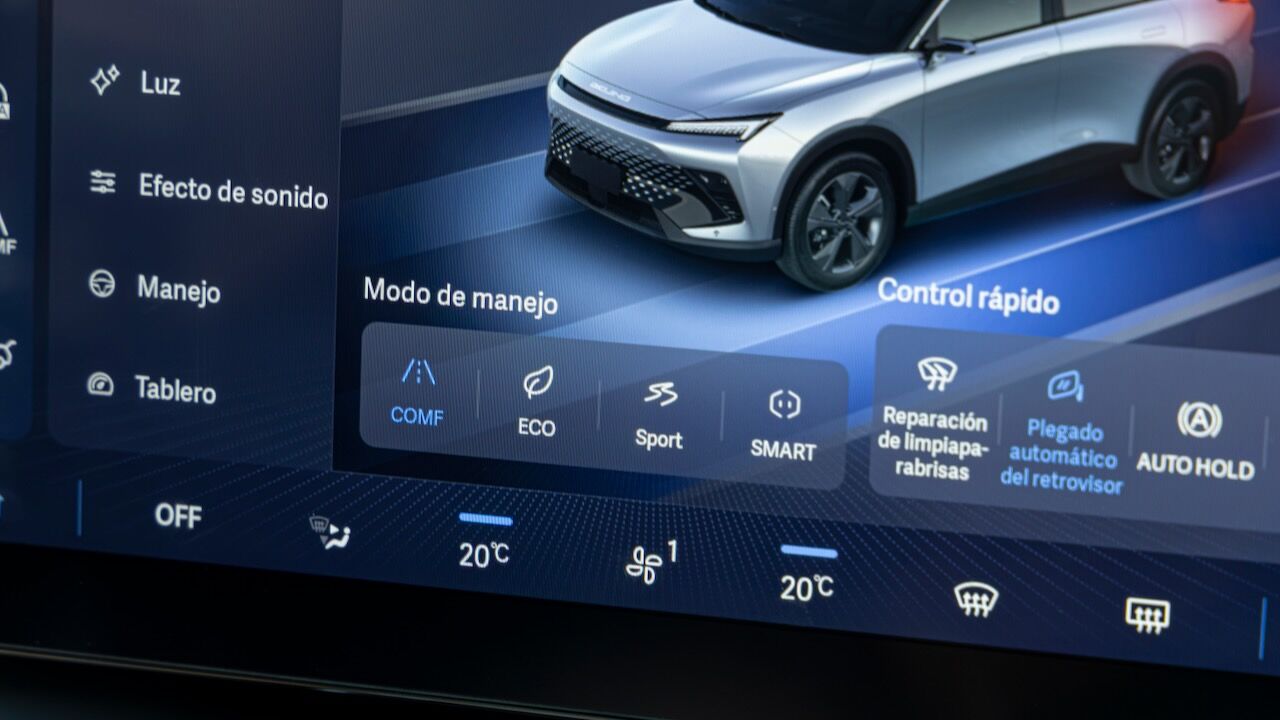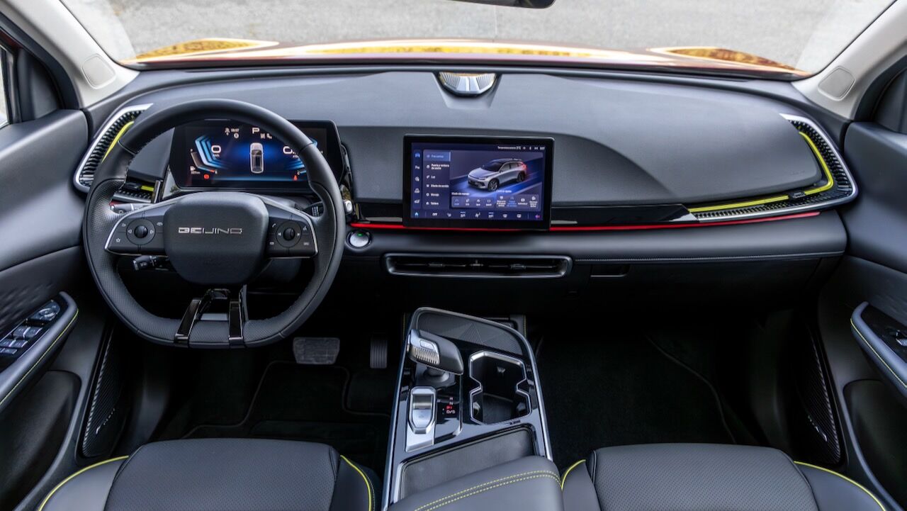 El habitáculo apuesta por un ambiente tecnológico, protagonizado por un salpicadero que integra dos pantallas de 10,2 pulgadas. La del lado izquierdo se corresponde con el cuadro de instrumentos digital y también está la otra táctil central para el manejo del sistema multimedia. Esa pantalla es compatible con Apple CarPlay y Android Auto (con cable) y sirve para controlar la mayoría de funciones, incluida la climatización. Entre el equipamiento de serie hay una completísima dotación, ya que el BAIC X55 no se ofrece con diferentes acabados.
