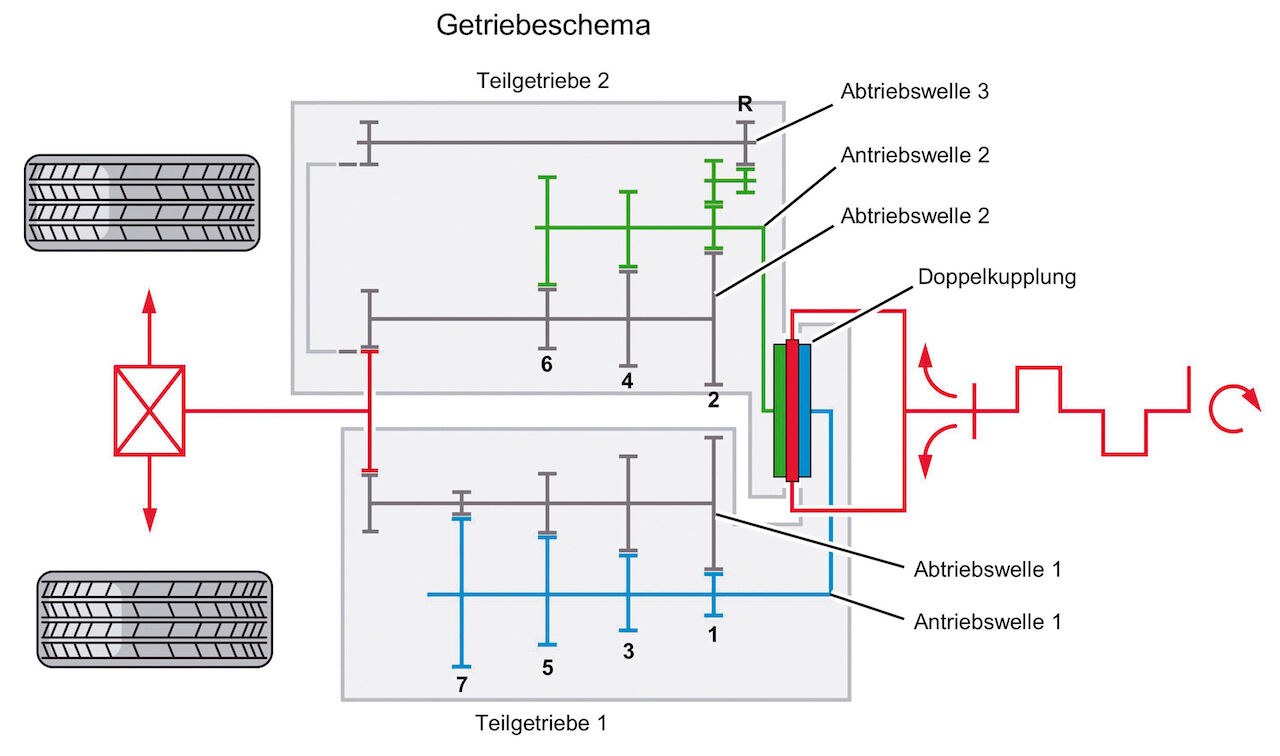 Las cajas de cambio automáticas de doble embrague tienen una configuración muy particular y reconocible. Al uso, se trata de dos cajas de cambio manuales que van unidas y que funcionan en paralelo. Cada una de ellas tiene su propio embrague y tres o cuatro velocidades, porque Volkswagen ha tenido DSG de seis y de siete marchas. Como se puede ver en el esquema anterior, una caja tendrá las marchas 1ª, 3ª, 5ª y 7ª (si procede) y la otra tendrá las marchas 2ª, 4ª y 6ª.