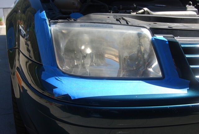 Antes de empezar, debes poner en remojo el papel de lija en un cubo de agua con un poco de producto de lavado para coches. Déjalo ahí entre 5 y 10 minutos. Aprovecha ese tiempo para colocar cinta adhesiva alrededor de los faros, ya que evitará que la pintura del coche se ralle cuando los lijas. Basta con que cubras unos cuantos centímetros, como en la foto más abajo.