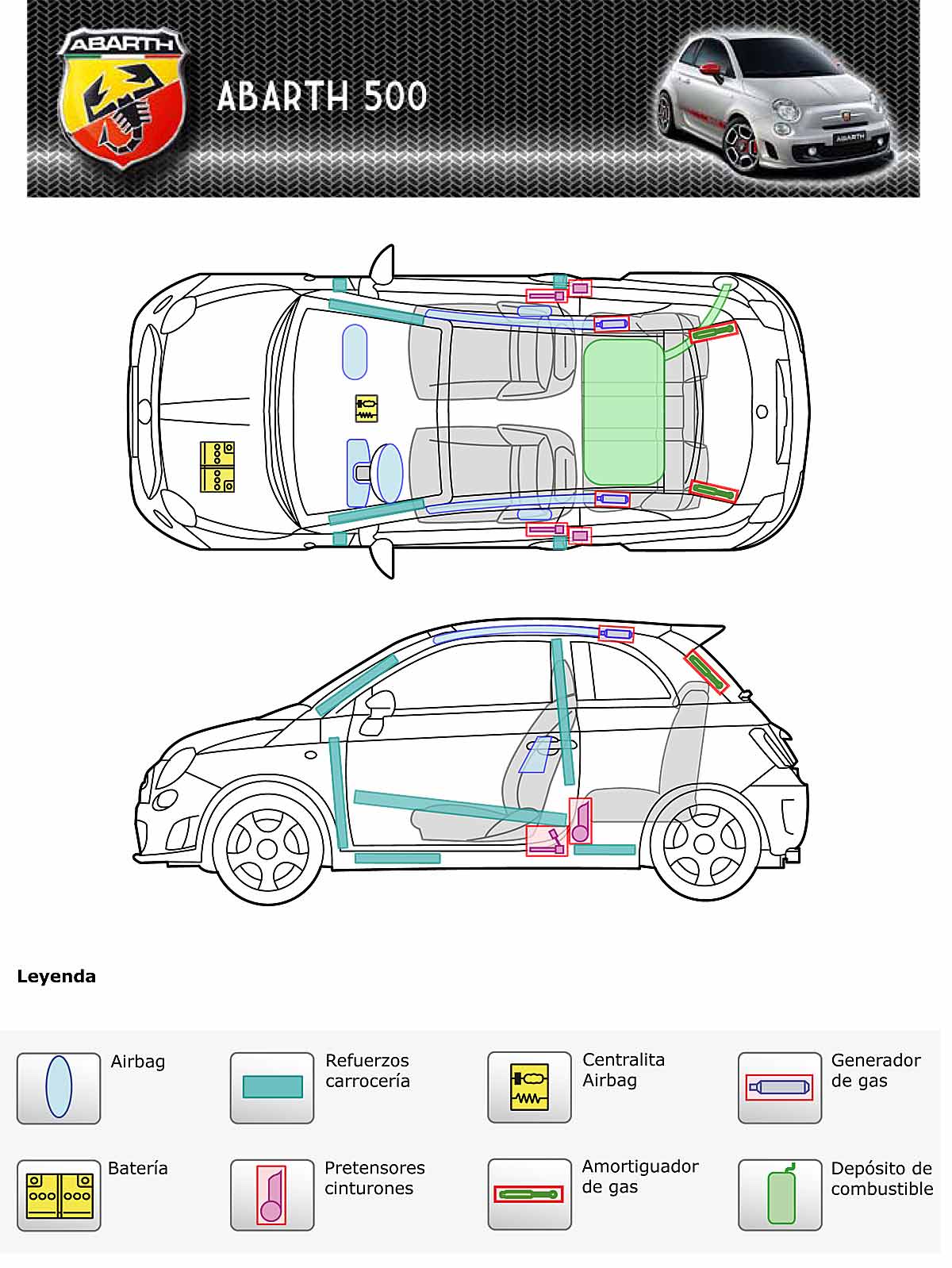En esa hoja de rescate hay dos planos del coche: vista aérea y lateral, con un código de colores para señalar las zonas que en cada caso importan a los rescatadores. Tienes que imprimirla y llevarla en el habitáculo, doblada en tres partes y guardada en el parasol del conductor. Para que los servicios de emergencia sepan que la tienes, vete a tu delegación del RACC más cercana, donde te darán una pegatina para poner en el parabrisas del vehículo.