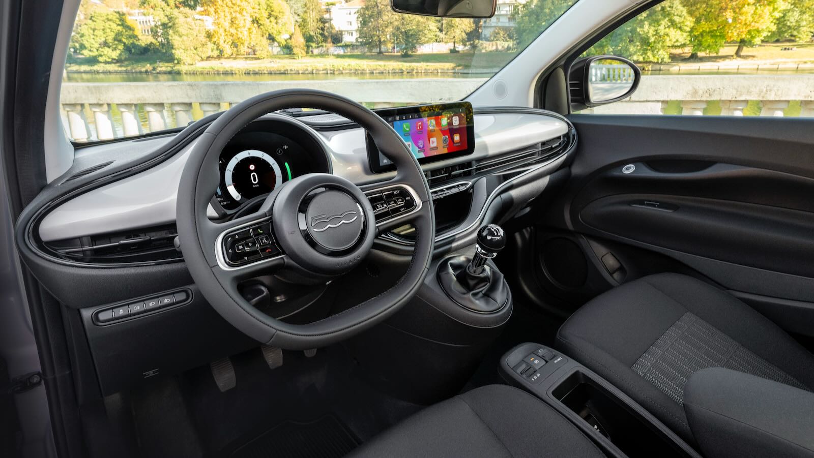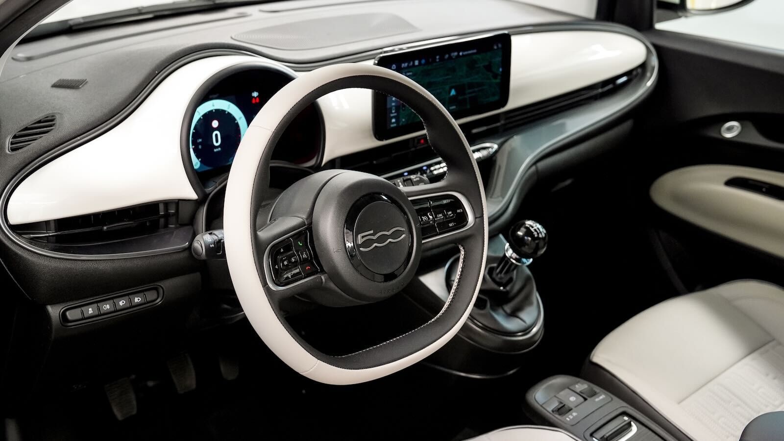 El interior del 500C 2026 introduce un salpicadero actualizado, especialmente en la variante Hybrid, para alojar la nueva palanca de cambio manual en posición central elevada (un guiño al diseño original del 500 2007.