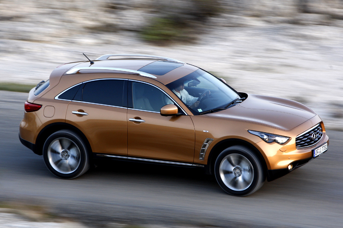 Está a la venta con dos motores de gasolina. Uno de ellos tiene una cilindrada de 3,7 l y una potencia de 320 CV. Consume 12,1 l/100 km y alcanza una velocidad máxima de 233 km/h. Acelera de parado a 100 km/h en 6,8 s. El segundo tiene una cilindrad de 5,0 l y una potencia de 390 CV. Consume un litro más que el anterior y alcanza una velocidad máxima de 249 km/h. Acelera de 0 a 100 km/h en 5,8 s. A lo largo de 2010 llegará al mercado una versión del FX diésel con una potencia de 238 CV.