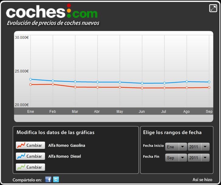 Una de las marcas que baja precios de sus vehículos forma sostenida a lo largo del año es Alfa Romeo. La marca es la única del Grupo Fiat cuyas ventas europeas han subido tanto a nivel europeo (un 48% el primer semestre, mientras las globales del Grupo bajan un 17%) y en España, (un 53% más de vehículos matriculados hasta agosto). Habrá que ver qué ocurre cuando empiece la renovación de la gama con la jubilación del Alfa 159.