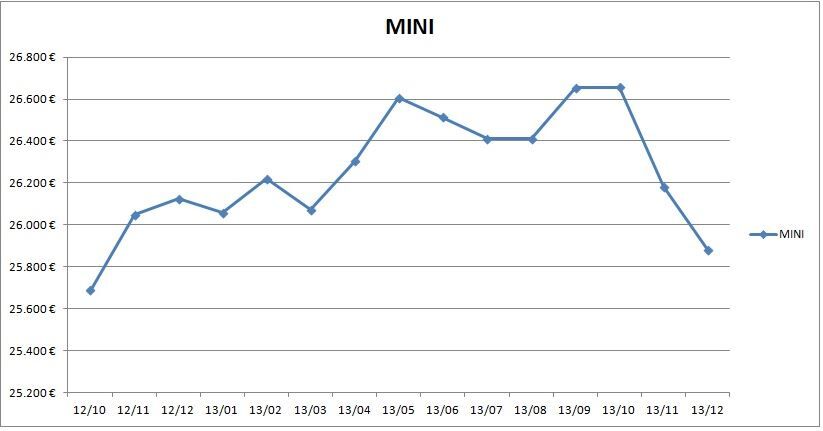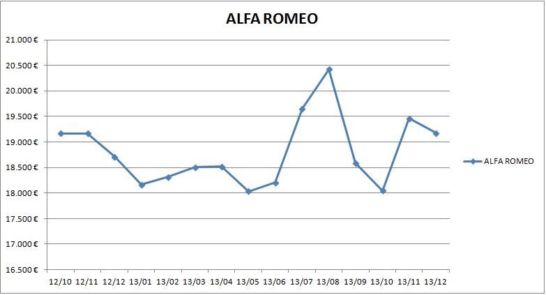 Los de Turín también han lanzado en el último trimestre los renovados Giulietta 2014 y Mito 2014. Su mayor equipamiento hizo que su precio repuntase desde los mínimos de octubre, si bien han vuelto a mejorar las ofertas de Alfa Romeo en concesionario oficial ligeramente de cara al último mes del año. En estos momentos hay unidades en stock con descuentos de hasta el 39%. Llama la atención la política de precios de Alfa Romeo, ya que repuntan cuando empiezan los planes PIVE (octubre 2012, febrero, julio y noviembre) y comienzan a bajar cuando las subvenciones llegan a término.