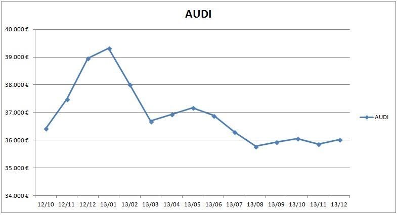 Si tenías pensado comprarte un Audi, el momento adecuado es ahora. Lógicamente, en esta gráfica se incluyen todos los modelos salvo el R8 y el A8 (hay ofertas interesantes de ambos en coches.com), pero son vehículos que la mayoría no puede permitirse en su garaje. Destacamos los bajos precios actuales del Audi A5 y el TT, quizá víctimas de las pobres ventas de los deportivos (único segmento que baja en sus ventas en noviembre). Pero incluso tienen muy buenos precios en diciembre los más vendidos, el Audi A3 y Audi A4, con precios de los más bajos del año y descuentos del 15% respecto al precio recomendadopor el fabricante. Localiza todas las ofertas de Audi en coches.com.