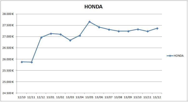 Tras la desaparición del Insight y el CR-Z la gama de la marca nipona es bastante reducida. Sus precios se han mantenido bastante estables a lo largo de todo el año. Analizando los datos a fondo descubrimos que el Honda Civic está en precios mínimos del año (un 26% de descuento en algún concesionario). Es lo más destacable dentro de las ofertas de Honda que ha localizado coches.com.