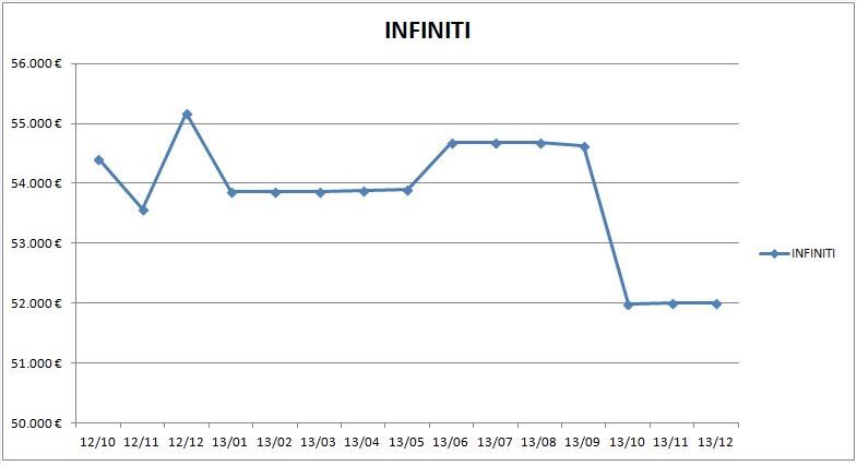 Hace unas semanas Infiniti cumplía cinco años en España. La marca se encuentra en un complejo proceso de renovación total, de crecimiento en ventas y prueba de ello es el nuevo Q50, una berlina de altos vuelos que llegó en septiembre y con la que rebaja el nivel de acceso a su gama (se observa claramente en el gráfico). Las ofertas de lanzamiento no son demasiado jugosas, pues entre las ofertas de Infiniti hay mejores descuentos en otros modelos de más alta gama... pero de menor volumen de mercado.