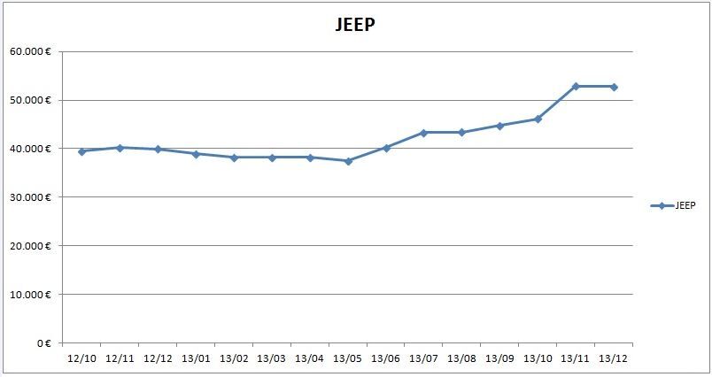 Nos llamó tanto la subida de los precios medios de Jeep que fuimos raudos a revisar qué había detonado esa explosión desde junio, cuando alzancaban mínimos. El terremoto es grande y se llama nuevo Grand Cherokee. El modelo de 2014 llegó ese mes a los concesionarios y se han ido sumando versiones más lujosas... sin apenas descuentos sobre los precios recomendados. Los precios del Jeep Wrangler se mantienen y el Compass cae ligeramente. Localiza las mejores ofertas de Jeep en coches.com.