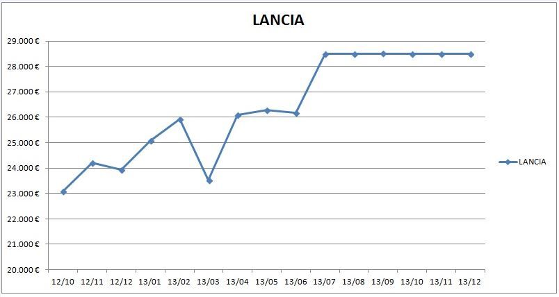 Las gráficas de precios de la marca italiana en el segundo semestre llaman la atención. En el caso de Lancia se debe al repunte del Delta y Voyager, con ligeros restyling a mediados de año. El resto de la gama; Ypsilon, Musa y Thema apenas han tenido cambios en los últimos 15 meses y cuentan con jugosos descuentos en concesionario, de hasta el 32%. Localiza las mejores ofertas de Lancia en coches.com.