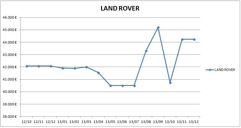 Una de las evoluciones de precios a lo largo de los últimos 15 meses que más nos ha llamado la atención es la de Land Rover. Cuando hemos revisado pormenorizadamente qué había ocurrido nos encontramos con que el causante de la subida de precios medios en verano ha sido el nuevo Land Rover Discovery 2014. Y la posterior bajada en octubre se debe al Range Rover Evoque, que mantiene desde entonces sus precios mínimos del año. ¿Por qué entonces han subido los precios en los dos últimos meses del año? Por culpa de un coche que no te esperas, el Defender Comercial, que ha sido despojado de todo descuento y sus precios han subido unos 3.000 euros de media. Localiza las ofertas de Land Rover nuevos en concesionario oficial en coches.com.