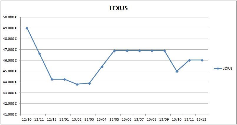 Los precios medios de Lexus fueron cayendo a finales de 2012 hasta situarse en mínimos en el primer trimestre del presente año. Luego subieron ya que llegó al mercado el nuevo Lexus IS 2014. En general, los precios del Lexus CT 200h se han mantenido estables, así como los del IS una vez se ha asentado en el mercado. Mención aparte merece el Lexus GS, principal responsable de la bajada a final de año, lo que indica que podría estar próximo su relevo. Localiza las mejores ofertas de Lexus en concesionario oficial en coches.com.