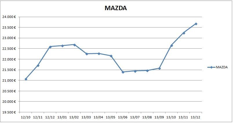 La subida de los precios medios de Mazda que vemos en la gráfica tiene un denominador común: la renovación de sus rpincipales modelos, con el nuevo Mazda 3 2014 (que llegó en junio) y el Mazda 6. También llegaron mejoras al monovolumen de la marca, el Mazda 5, allá por febrero. La subida media, ed unos 2.000 euros se debe a que suben los precios de estos modelos nuevos y renovados... pero también del resto de la gama, más ligeramente, a finales de año. No obstante, si te ha conquietado la línea y mecánicas de los japoneses (nada extraño por otra parte) puedes localizar las mejores ofertas de Mazda en coches.com, ya que algunas versiones de los últimos modelos, el Mazda 3 y el Mazda 6, cuentan con descuentos interesantes de en torno al 20% respecto a los precios recomendados.