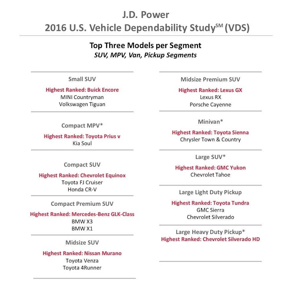 Uno de los estudios más veteranos es el que realiza JD Power con 27 años a sus espaldas. En él analizan las respuestas de 33.560 propietarios tres años después de que hayan comprado el coche. El estudio fue realizado entre octubre y diciembre de 2015, por lo que se añalizan coches comprados en su mayoría en 2013. Miden la fiabilidad por el número de problemas experimentados por cada 100 vehículos (PP100), así que una puntuación más baja refleja una mayor calidad de fabricación.