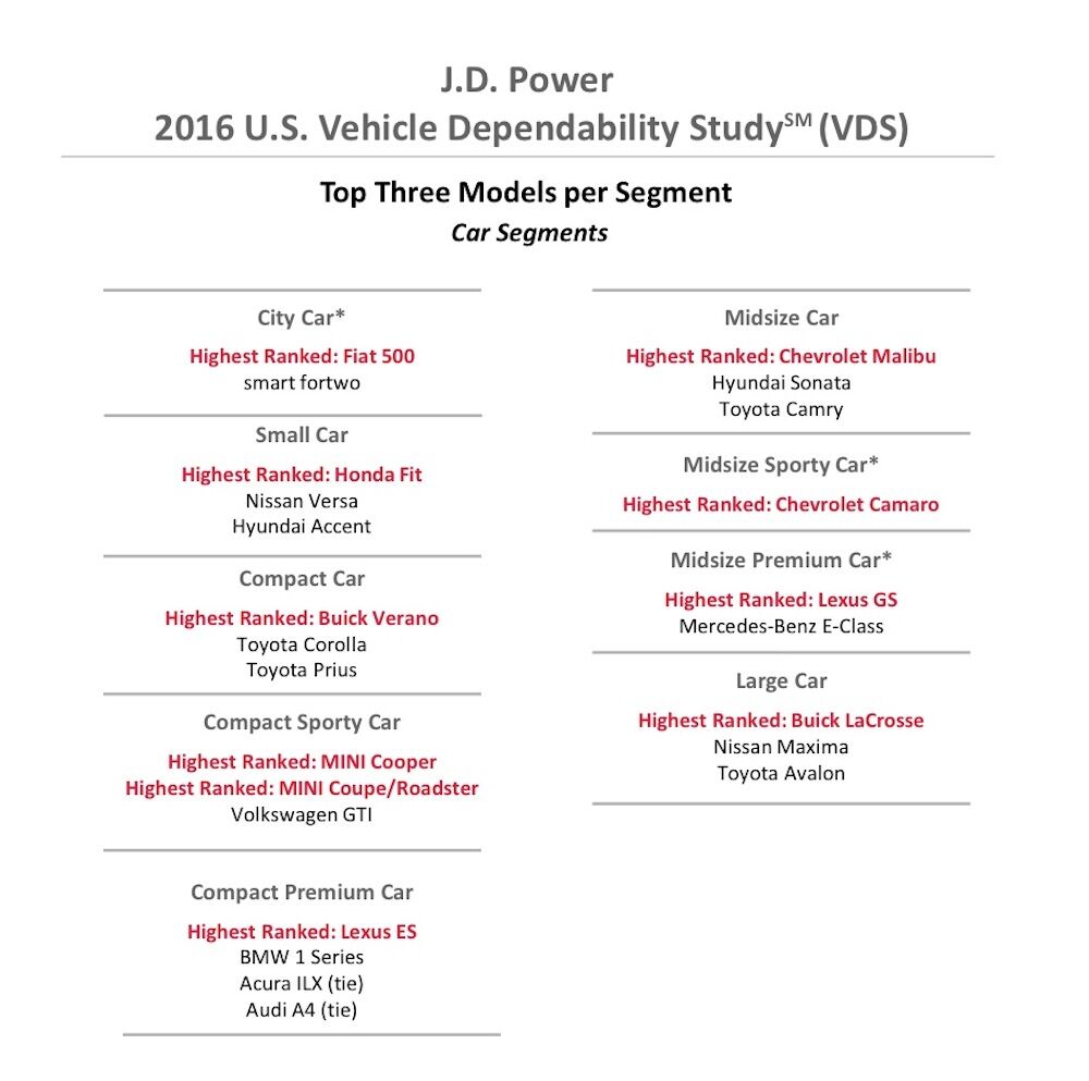 En la categoría de modelos analizados en el Estudio JD Power 2016, General Motors Company recibe ocho premios de segmento y Toyota Motor Corporation seis. Pero no son los únicos. De los modelos que se venden en nuestro mercado el Fiat 500 se coloca por delante del smart y el Honda Jazz (Fit) supera al Nissan Note y Hyundai i20.