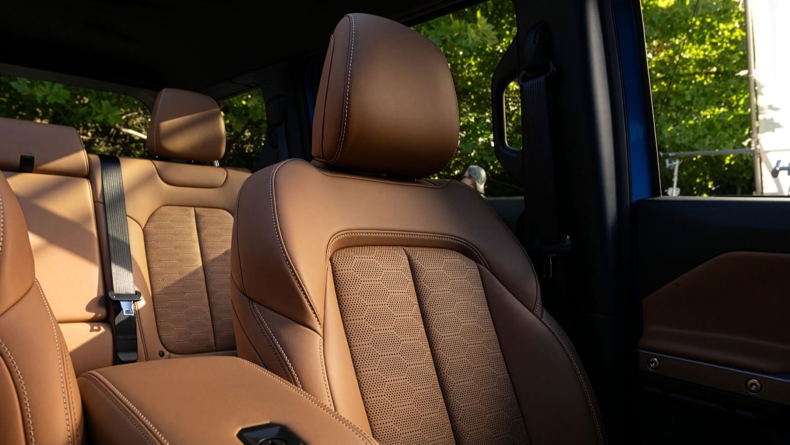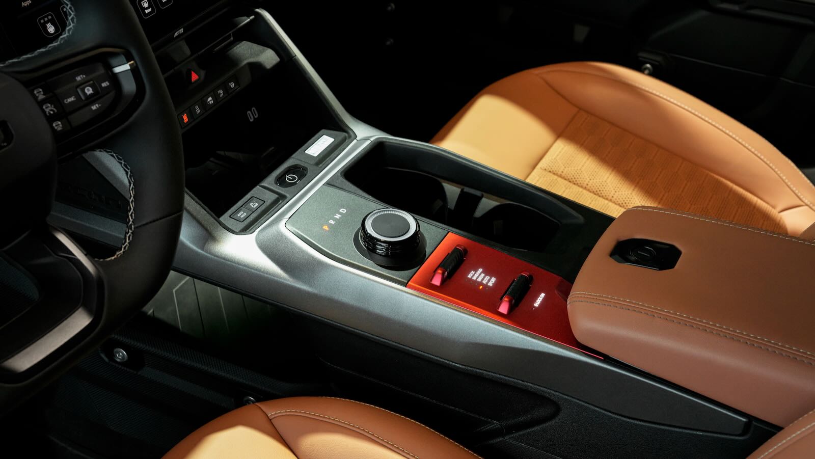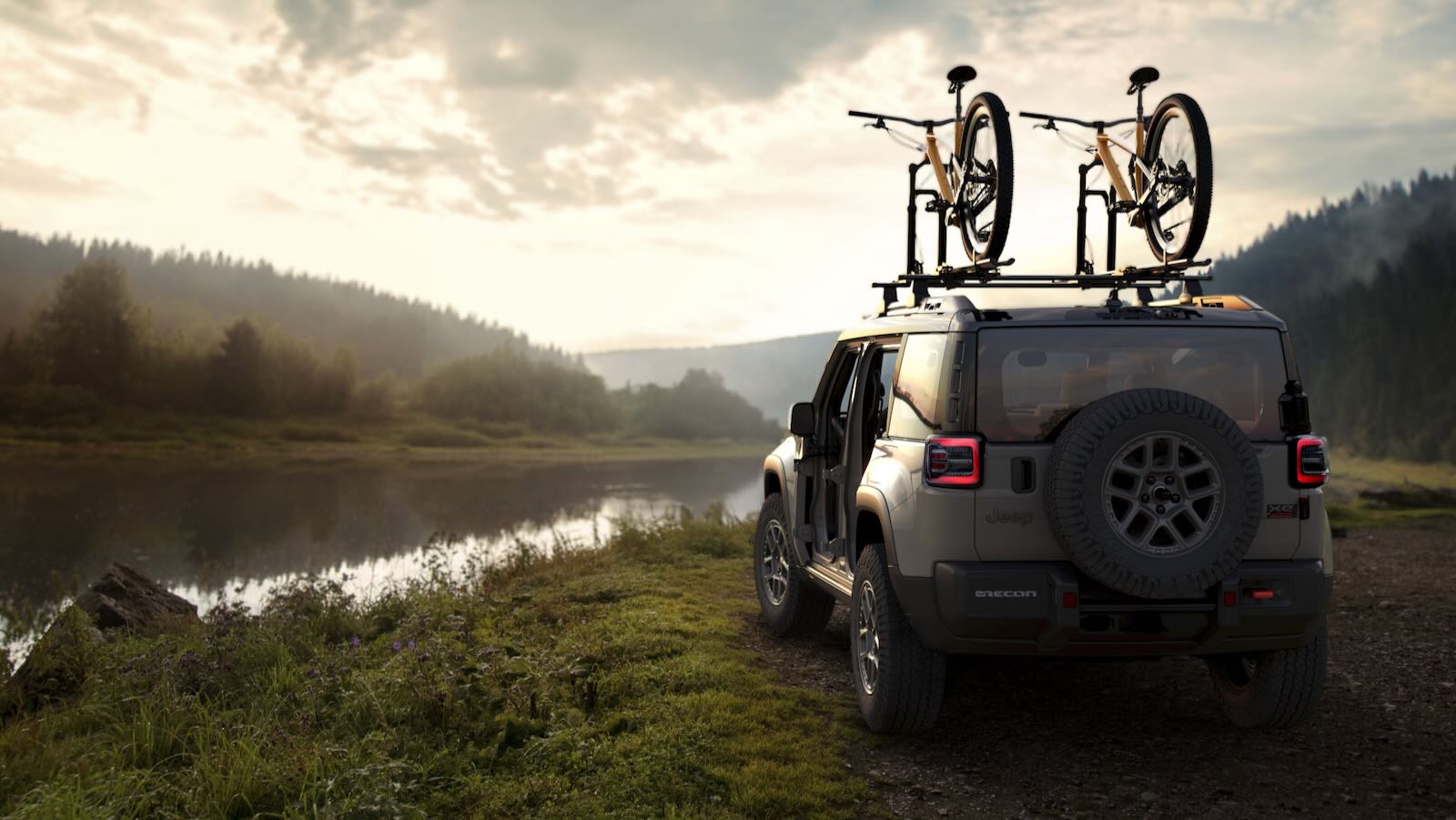 El Recon combina el legado visual del Wrangler. Mantiene la parrilla de siete ranuras icónica, ahora iluminada por LED, y pasos de rueda marcados y angulosos. El frontal ofrece ópticas U-LED, mientras que la parte trasera destaca por pilotos cuadrados LED y portón con apertura lateral y rueda de repuesto exterior, todo un guiño al Wrangler.