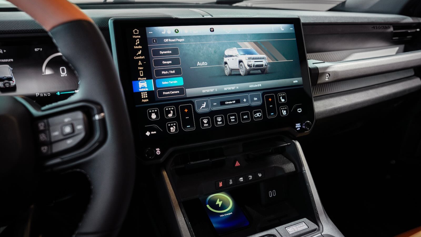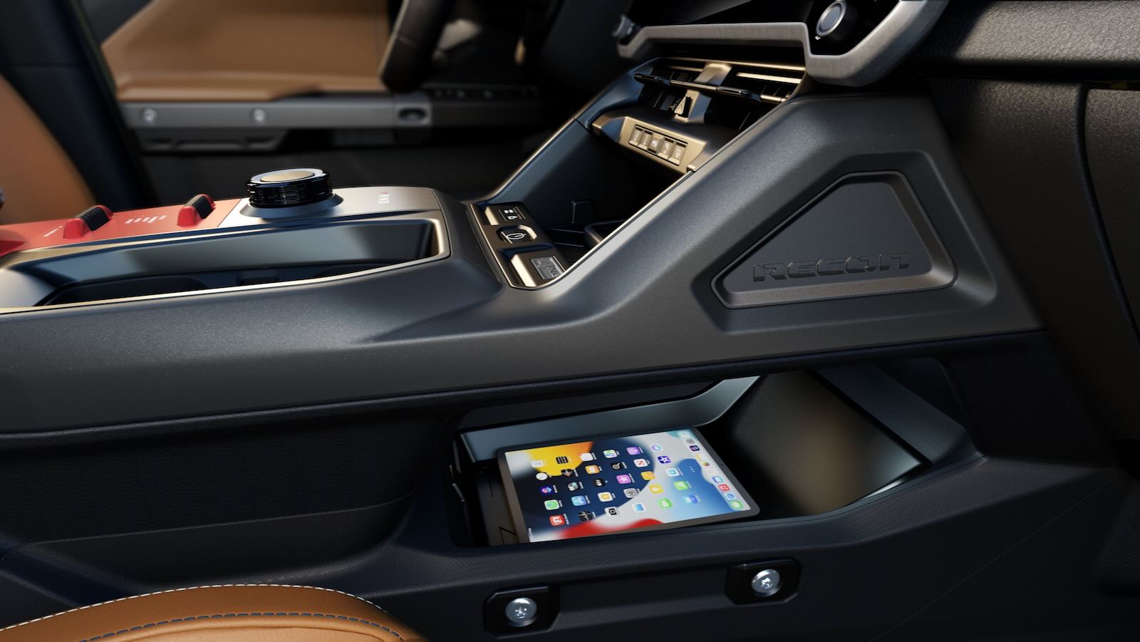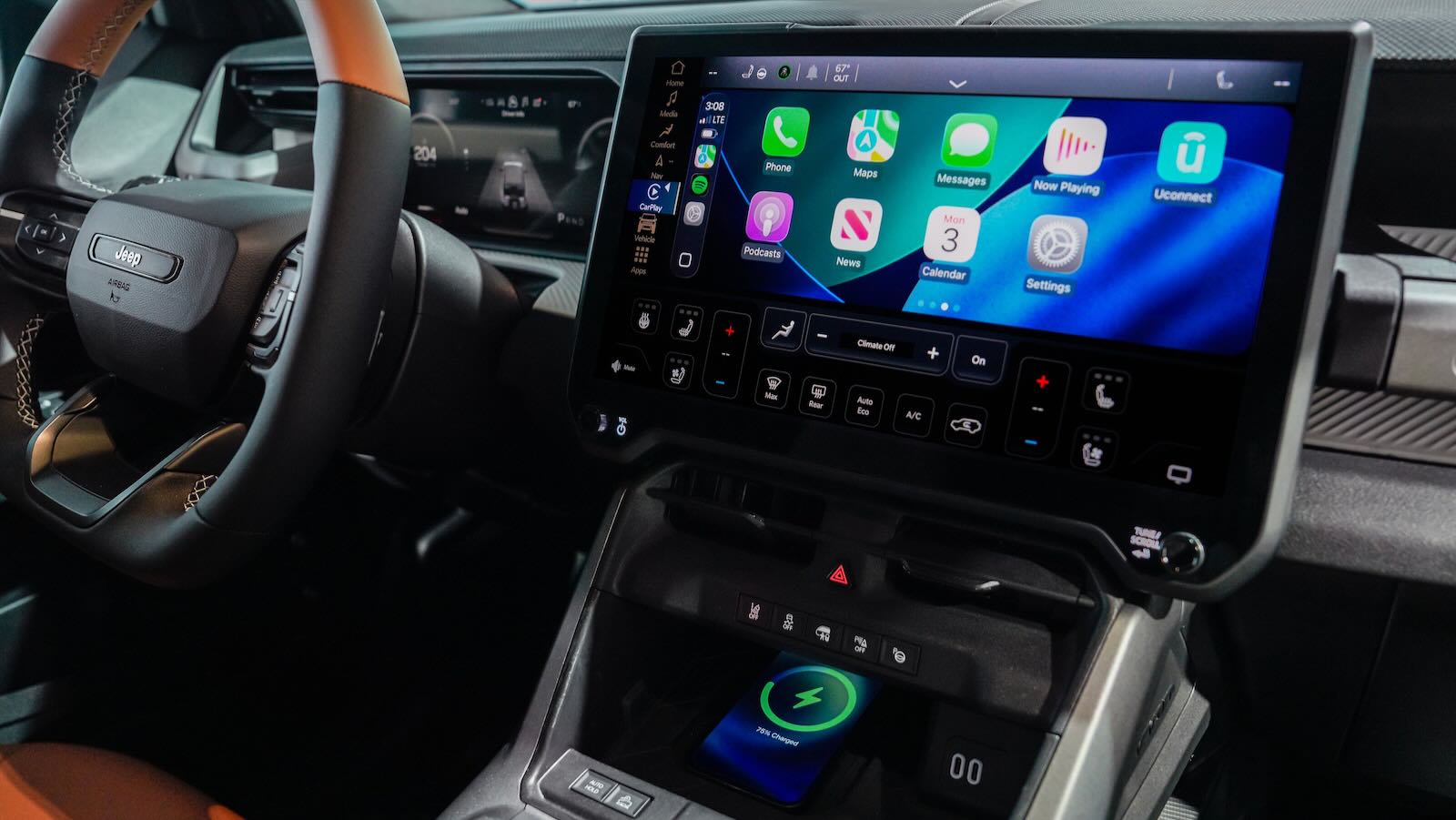 El Recon dispone de dos grandes pantallas: instrumentación digital de 12,3 pulgadas y un display táctil horizontal de 14,5 pulgadas, ambos con gráficos personalizables y sistema UConnect 5, que ofrece compatibilidad con Alexa, Apple CarPlay y la app Jeep Connect para monitorizar y funciones remotas. Además, cuenta con sistema de audio Alpine bajo los asientos (para pode usarlo descapotable).
