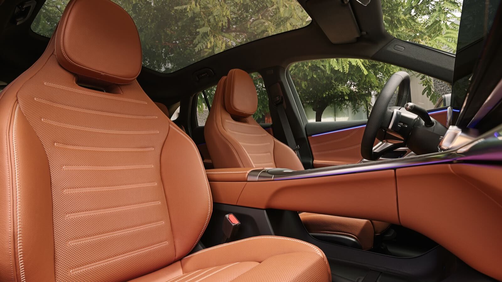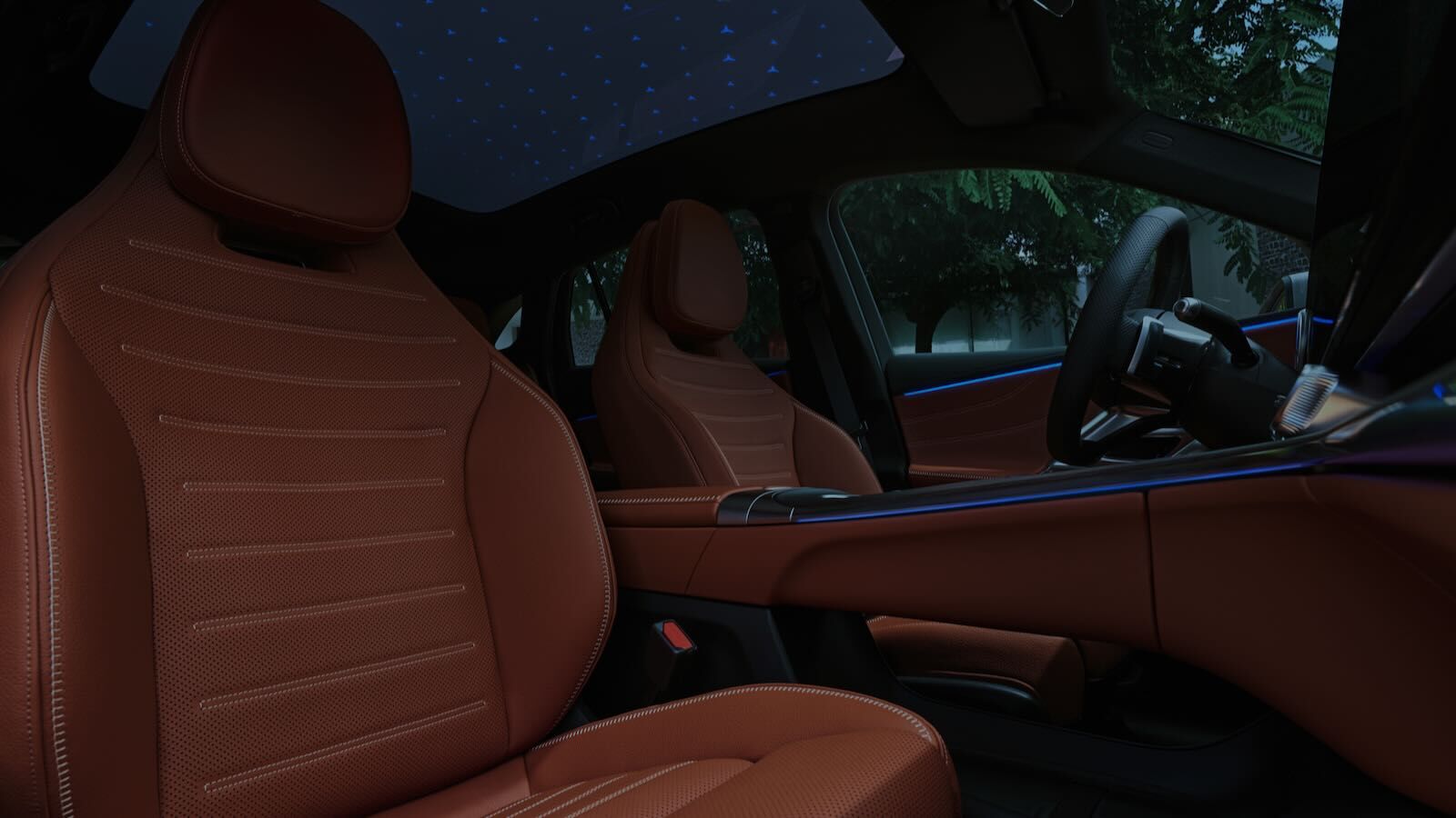 La iluminación ambiental juega un papel protagónico, enmarcando el interior y creando una atmósfera única. Opcionalmente, el techo panorámico SKY CONTROL con vidrio conmutable puede iluminar 162 estrellas integradas en el cristal, creando un efecto «cielo estrellado» por la noche.