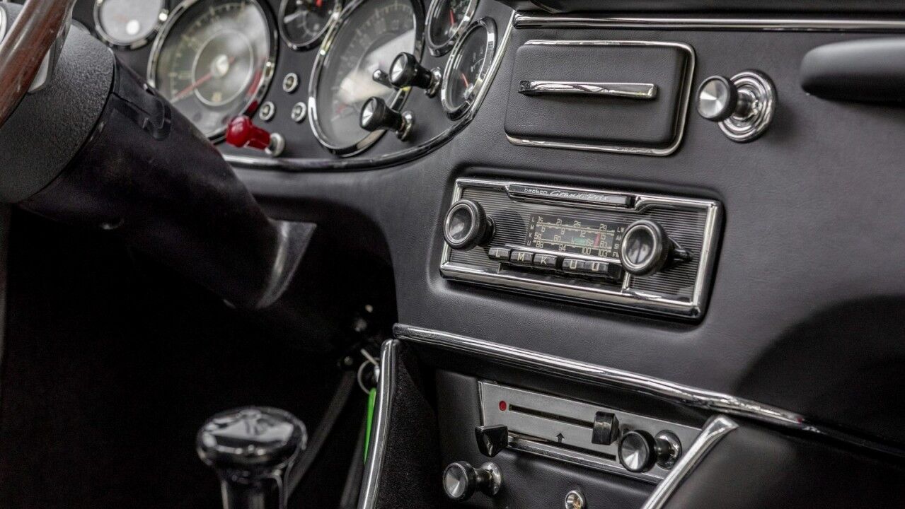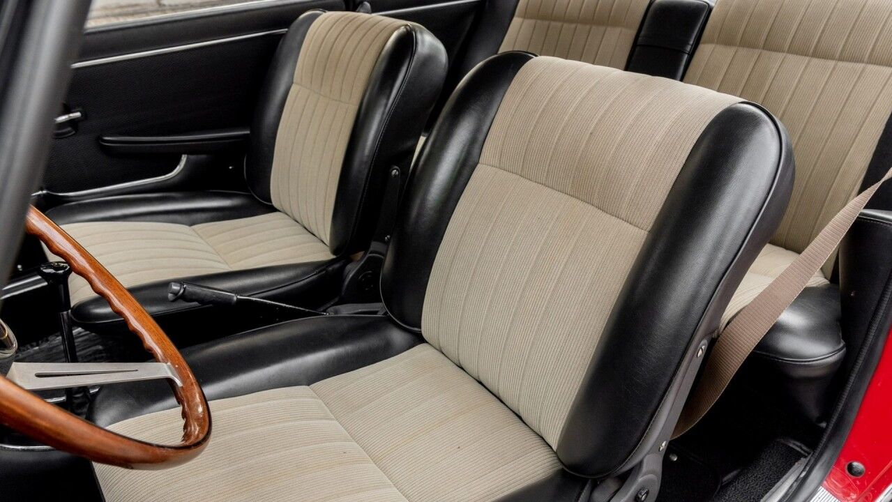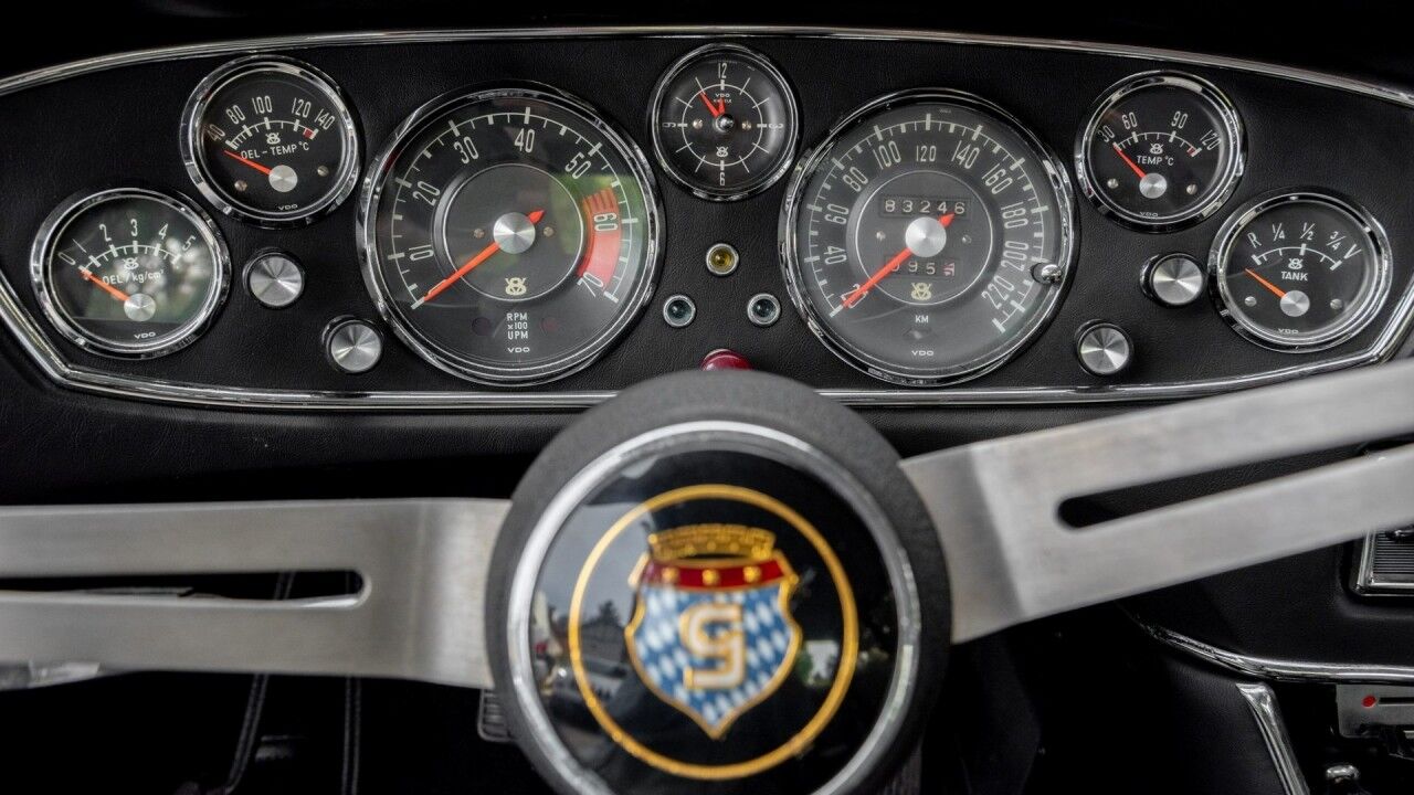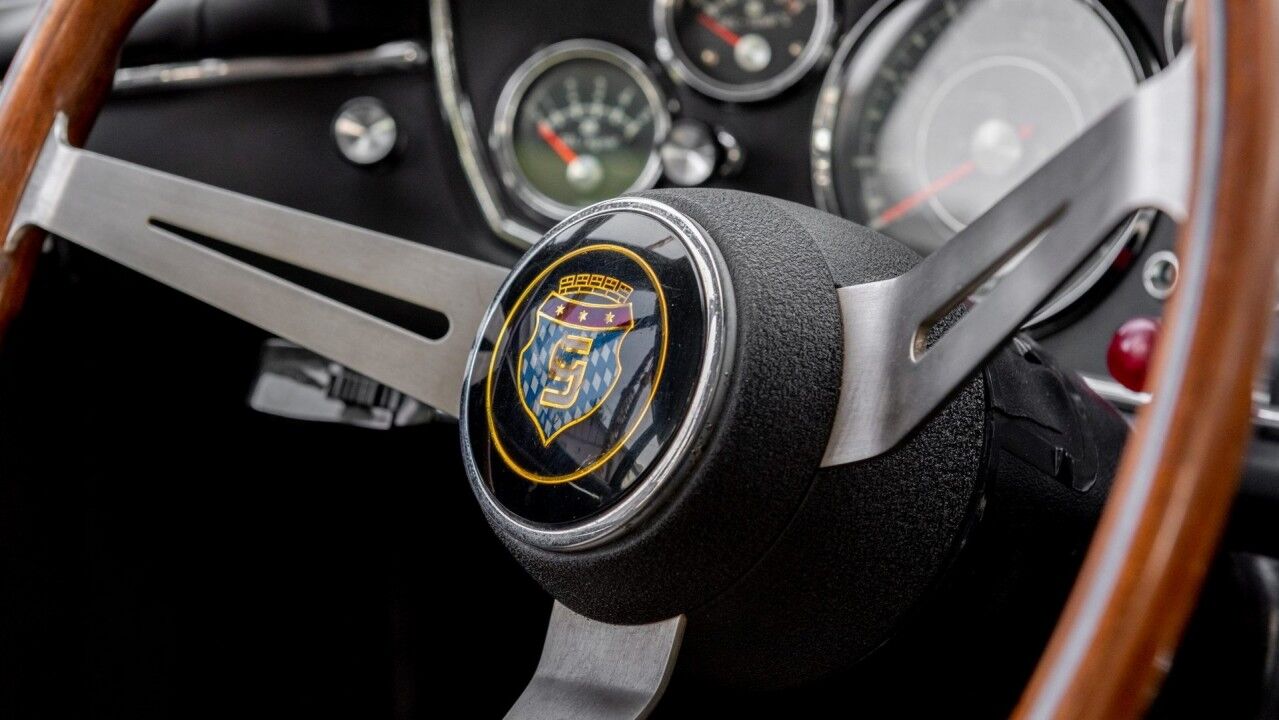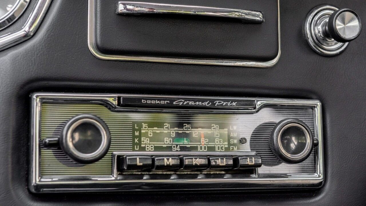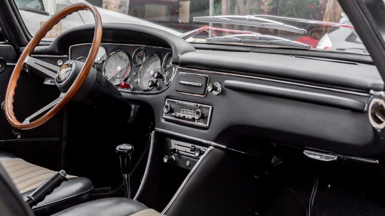 En el habitáculo, la tapicería luce un acabado bitono de vinilo negro y pana beige. Además del velocímetro, el tacómetro y el indicador del nivel combustible habituales, el cuadro de instrumentos también incluye medidores para la temperatura del aceite, la temperatura del agua y la presión del aceite. A bordo se pueden encontrar comodidades como cinturones de cintura, un sistema de calefacción y una radio de tres bandas Becker Grand Prix. El volante de madera y la sencilla consola central se suman a lograr una acogedora apariencia.