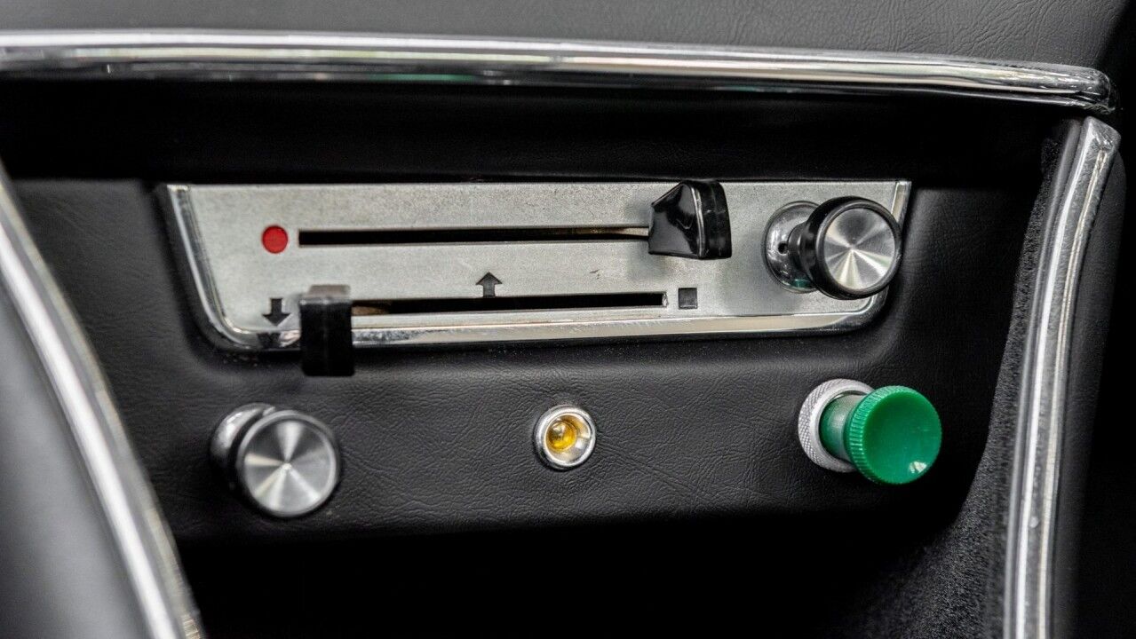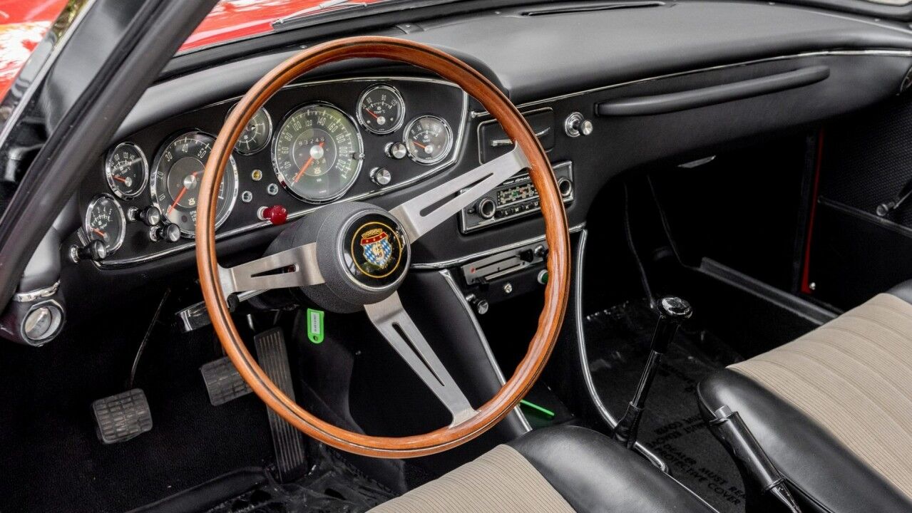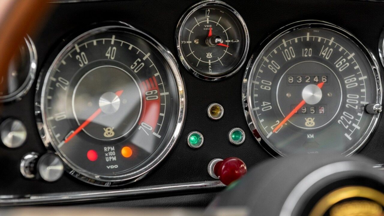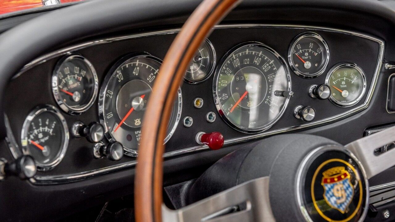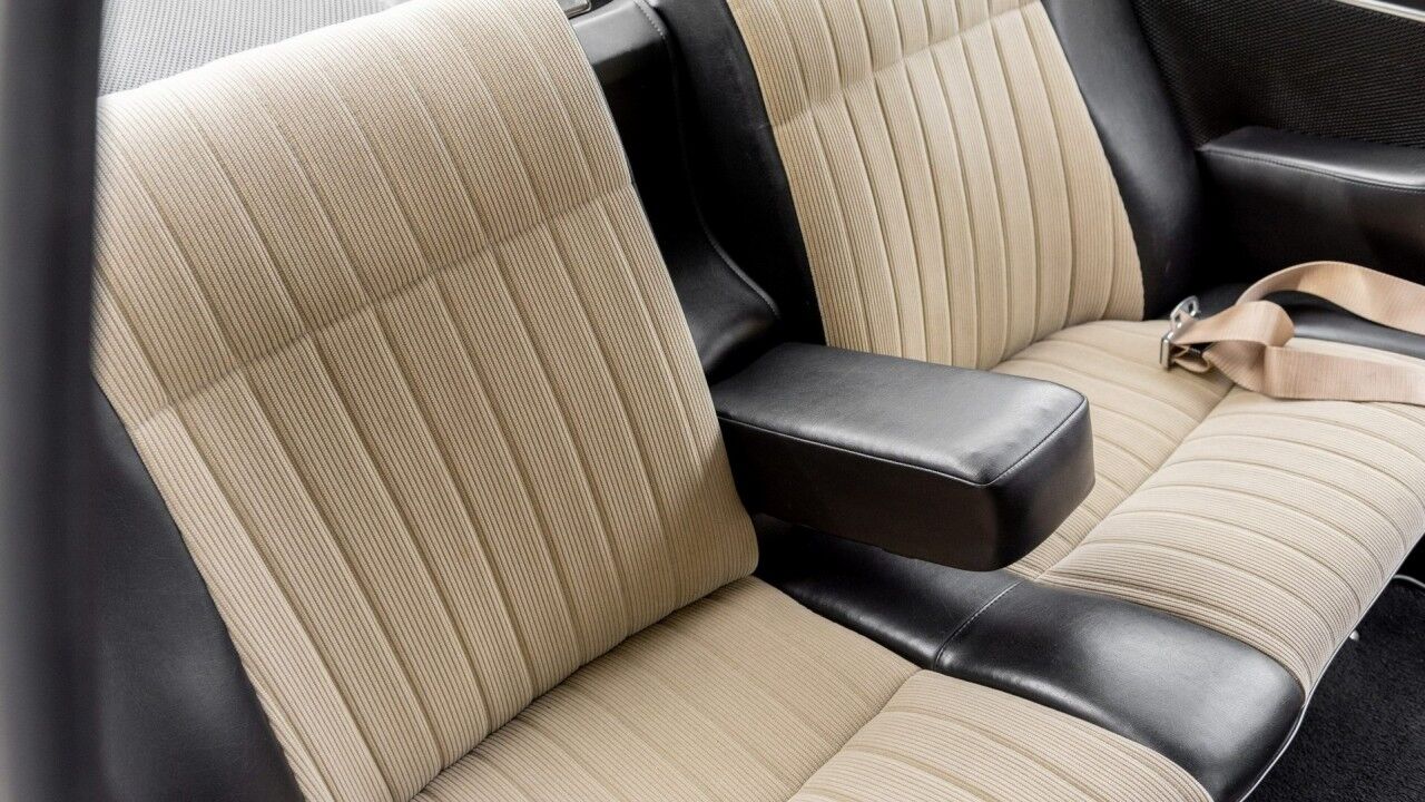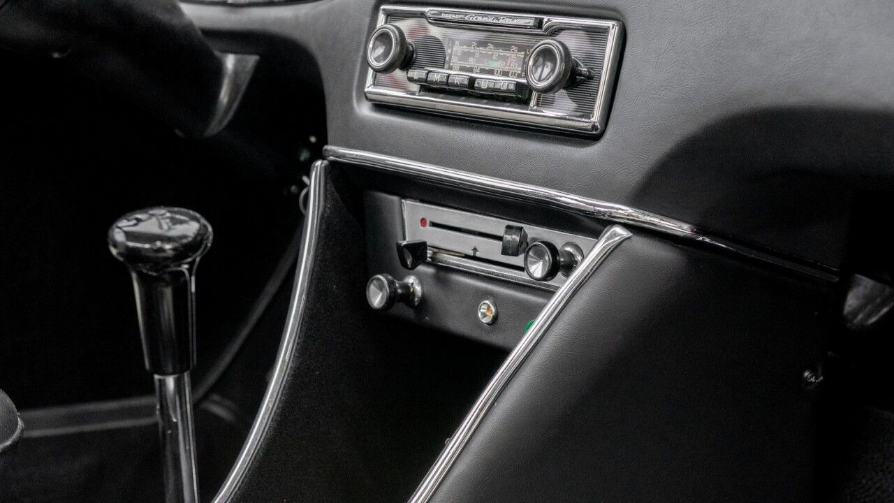 En el habitáculo, la tapicería luce un acabado bitono de vinilo negro y pana beige. Además del velocímetro, el tacómetro y el indicador del nivel combustible habituales, el cuadro de instrumentos también incluye medidores para la temperatura del aceite, la temperatura del agua y la presión del aceite. A bordo se pueden encontrar comodidades como cinturones de cintura, un sistema de calefacción y una radio de tres bandas Becker Grand Prix. El volante de madera y la sencilla consola central se suman a lograr una acogedora apariencia.