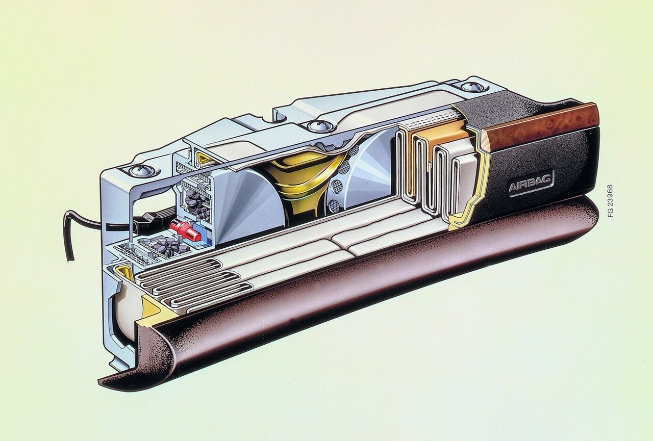Hace ahora 30 años, cuando el primer airbag del acompañante se mostró sobre el Clase S de la época, la bolsa y todo su mecanismo ocupaban el espacio anteriormente reservado a la guantera frente a la plaza del pasajero del asiento delantero. El dispositivo era bastante más grande y pesado que el del airbag del conductor. Frente a los dos kilos de este, el del acompañante pesaba unos cinco kilos y ocupaba bastante más espacio dado que el tamaño de su bolsa y, consecuentemente, su mecanismo de inflado, tenían que ser forzosamente mayores al tener el cojín de aire que cubrir un mayor espacio dada la mayor distancia existente entre la posición del airbag y la del ocupante, puesto que no había volante entre medias. Su volumen, 170 litros, era prácticamente el triple que el del airbag del conductor, que apenas tenía que inflar una bolsa de 60 litros.