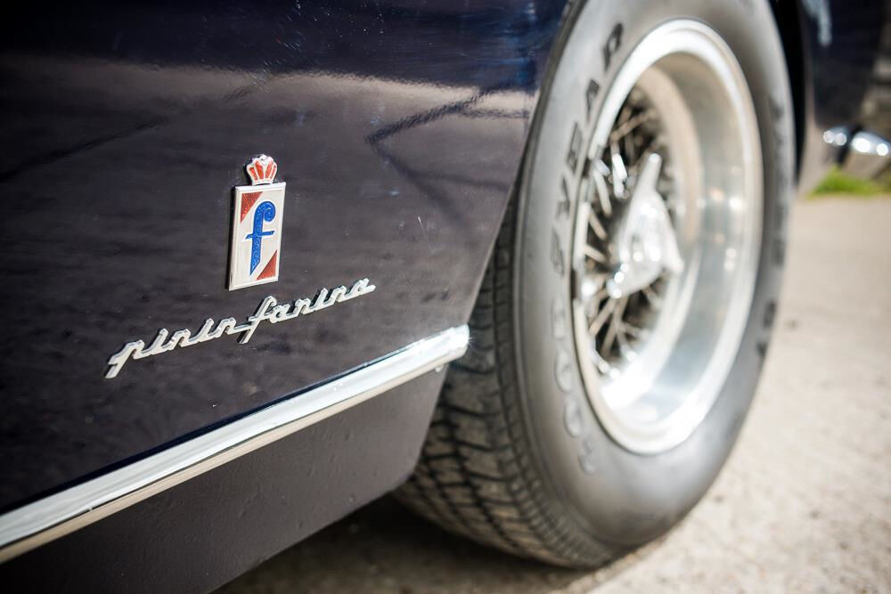 El trabajo con los cromados ha sido excepcional y consiguió las ruedas Borrani originales (de serie sólo en la Serie 1), incluso la de repuesto, que tanbién han sido cuidadosamente restauradas. Las «credenciales» del logo de Pininfarina se han colocado en los cuartos traseros, pero no quiso montar los dos emblemas del Cavallino Rampante en las aletas delanteras. Sí cambió el sistema de escape, por uno de acero inoxidable.