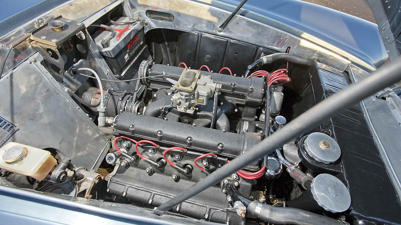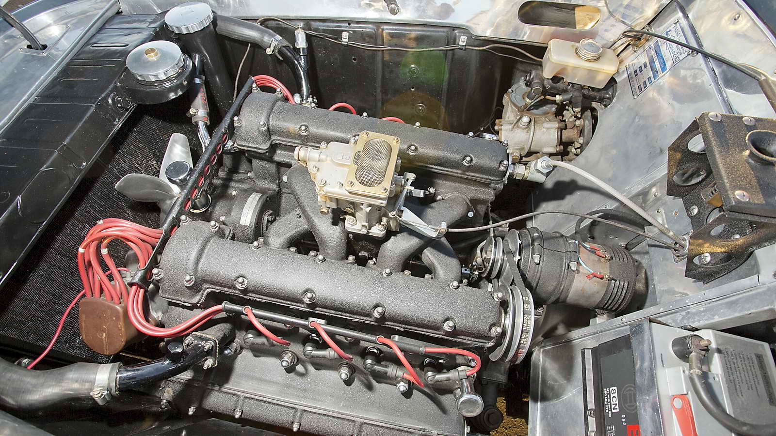 En lo que al aspecto dinámico se refiere equipa un motor V8, con 4 árboles de levas en cabeza y 2.814 centímetros cúbicos, alimentado por 2 carburadores Weber de doble cuerpo, con lo que obtiene una potencia máxima de 165 CV que se transfieren al suelo a través de una transmisión manual de 5 velocidades en configuración transaxle (situado en el eje trasero formando bloque con el diferencial). Por su parte la suspensión delantera es de tipo independiente, con barras de torsión y amortiguadores hidráulicos telescópicos, mientras que en el eje trasero se utiliza un puente tipo De Dion, con barras de torsión y amortiguadores. Los frenos son de tambor a las cuatro ruedas.