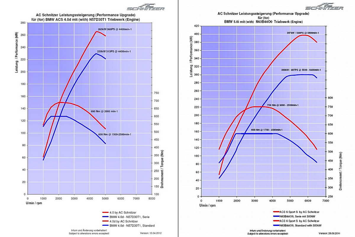 Todo esto no sería necesario si se mantuvieran las prestaciones “de serie”, pero es que éstas también se han visto alteradas por las mejoras introducidas en los propulsores. Como recordaréis existe la posibilidad de elegir entre plantas motrices movidas por gasóleo o por gasolina. Para el primer caso, el BMW 640d, que ofrece 313 CV de potencia de serie, se ha incrementado la misma hasta alcanzar los 360 CV, en ambos casos a 4.400 rpm, mientras que el par motor máximo va desde los 630 Nm, entre 1.500 y 2.500 rpm, del modelo de serie hasta los 690 Nm a 2.000 rpm del modelo modificado. La velocidad máxima no experimenta variación ya que continúa autolimitada a 250 km/h, pero sí mejora en 2 décimas la aceleración de 0 a 100 km/h hasta quedar en 5,1 segundos. Otro tanto ocurre con el BMW 650i, con 407 CV de serie entre 5.500 y 6.400 rpm, que pasa a ofrecer 540 CV a 5800 rpm en la versión potenciada por AC Schnitzer, mientras que el par máximo escala desde los 600 Nm, entre 1.750 y 4.500 rpm, hasta unos increíbles 750 Nm, entre 3.000 y 3.500 rpm. La velocidad máxima pasa de estar limitada electrónicamente a 250 km/h a librarse de dicha limitación y lograr superar la cota de los 310 km/h, mientras que la aceleración mejora desde los 5 a los 4,4 segundos para alcanzar los 100 km/h desde parado.