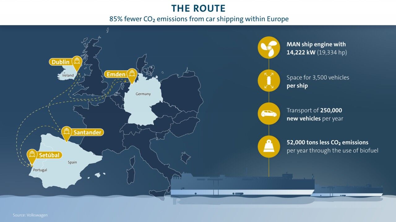 Para los envíos europeos, Volkswagen alquila continuamente dos buques que transportan hasta 3.500 vehículos en una ruta que va desde la ciudad germana de Emden hasta Dublín, en Irlanda, y pasa por Santander, España, y Setubal, Portugal, antes de regresar de nuevo a Emden; un viaje que hace unas 50 veces al año. En el transcurso de sus trayectos, transportan cada año alrededor de 250.000 coches nuevos de las marcas Audi, SEAT, Škoda y la propia Volkswagen; los modelos de Bentley, Bugatti, Cupra, Lamborghini, MAN, Porsche y Scania optan por otras vías de entrega.