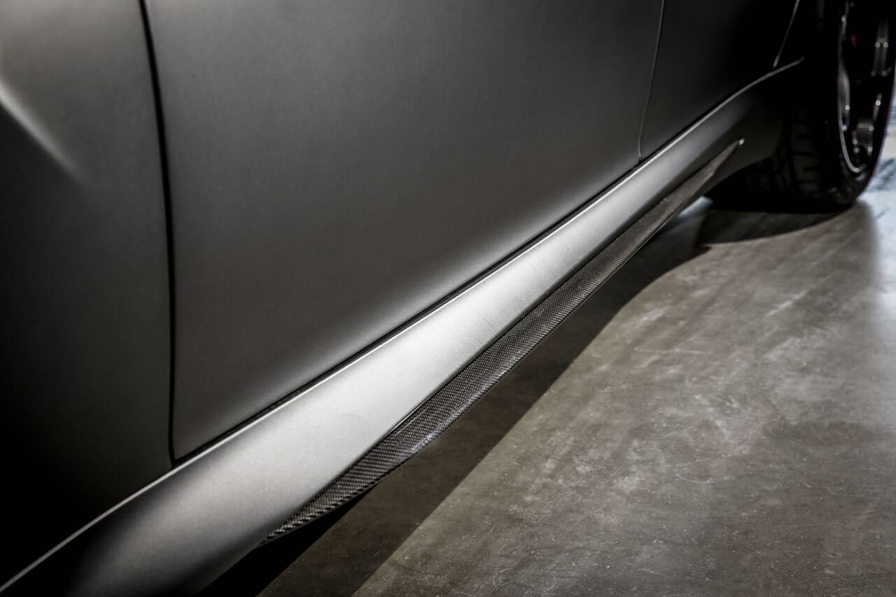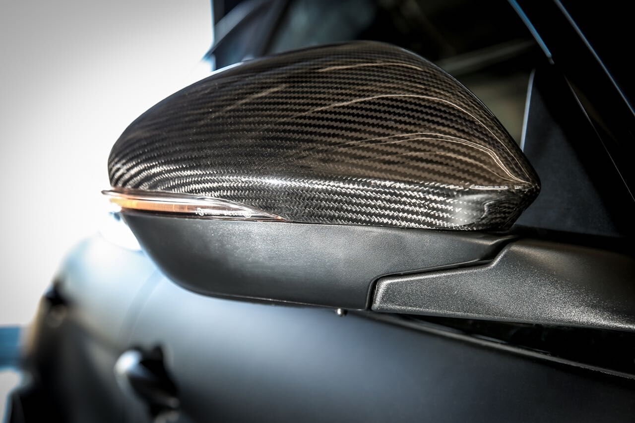 El exterior, además del color de la carrocería, tiene elementos de fibra de carbono, como el emblema delantero, tapas de retrovisores y faldones. El Giulia estrena techo de carbono y e Stelvio con un techo panorámico.