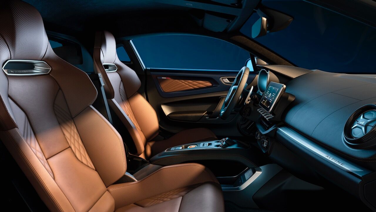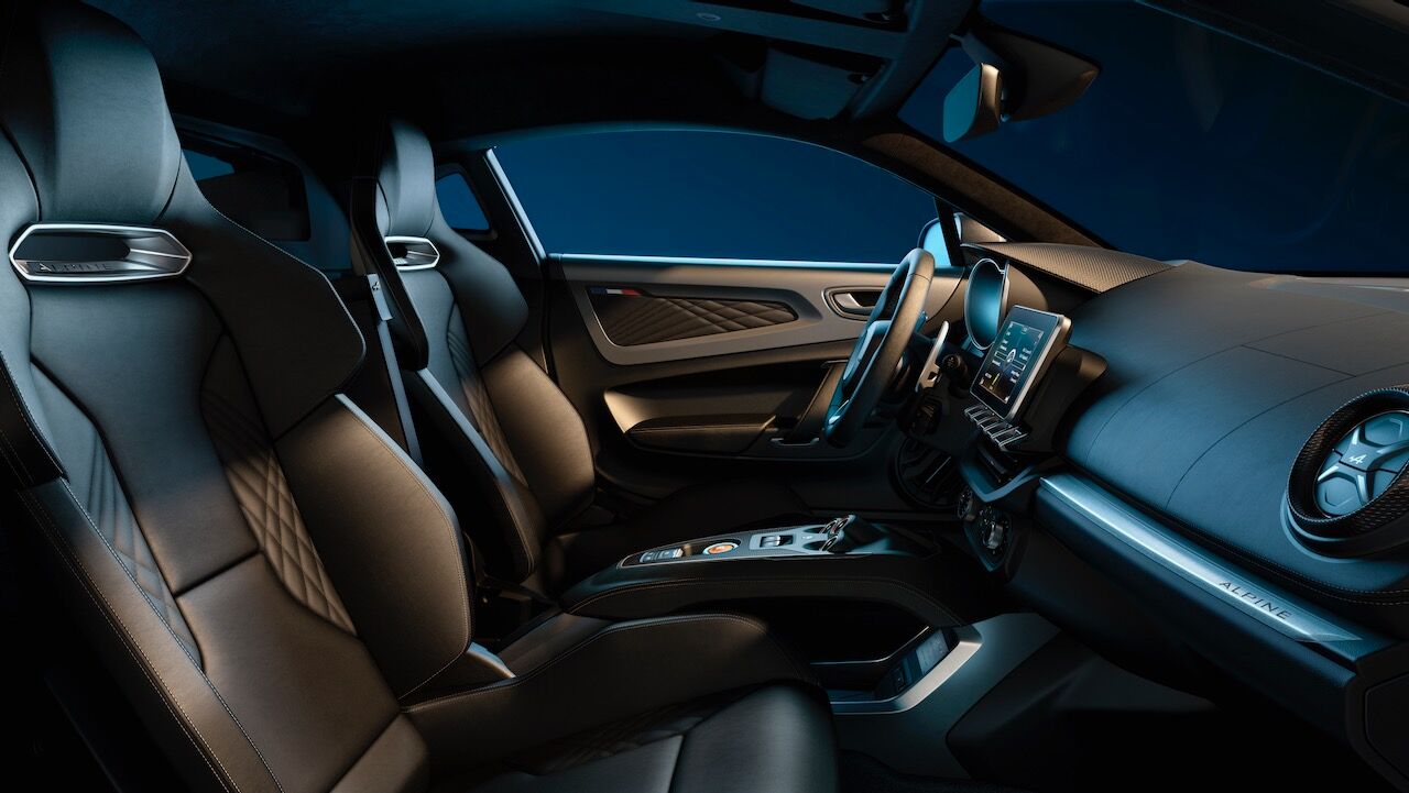 Por dentro lo que más destaca son los asientos Confort Sabelt, que le aportan un extra de comodidad a este Alpine A110 Légende GT 2021. Lo consiguen gracias a los reglajes eléctricos de seis vías y se ofrecen con dos tapicerías distintas. Los que llevan el exterior en plateado tienen cuero negro con pespuntes en gris, mientras que los azules visten tapicería de cuero marrón ámbar. El cuero se extiende a la zona de las puertas y el techo va en microfibra Dinámica con remates de carbono brillante.