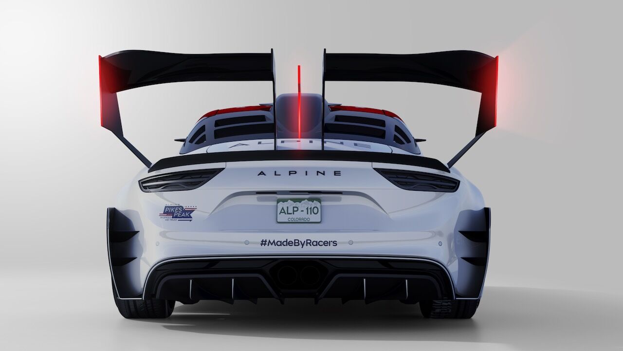 Para su primera participación en esta carrera, Alpine se ha unido a Signatech para crear un A110 realmente especial. La subida a Pikes Peak, en Colorado (Estados Unidos), consiste en 19,93 kilómetros de ascenso, en los que se pasa de estar a 2.866 metros sobre el nivel del mar a coronar a nada menos que 4.301 metros. Son 156 curvas con una pendiente promedio del 7 %. Por estas características, lo más importante es conseguir una carga aerodinámica extrema que mantenga el coche pegado al suelo y una mecánica preparada para resistir la escasez de oxígeno a esa altura.