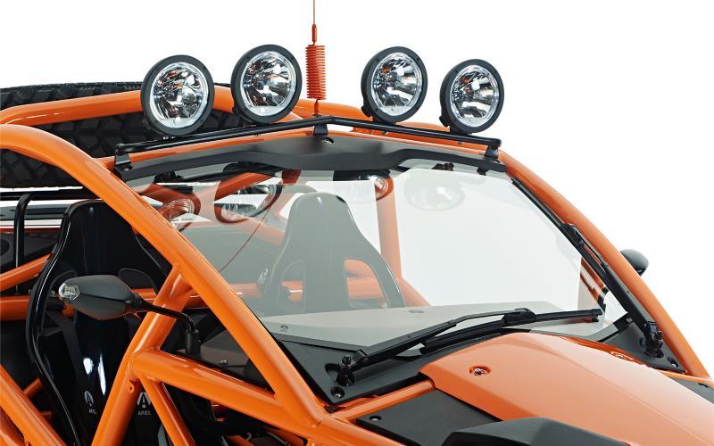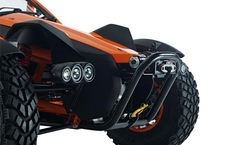 Por otro lado, las suspensiones no solo se han cubierto con unas tapas para evitar su deterioro, sino que su regulación y sistema están única y exclusivamente diseñadas para terrenos con irregularidades, es decir, son algo más blandas que las del Atom. Por último, se han incorporado extras que aseguran la conducción sobre el terreno, como pueden ser los focos que incorpora en la parte superior, y unos accesorios para remolcar, además de la rueda de repuesto en la parte posterior.