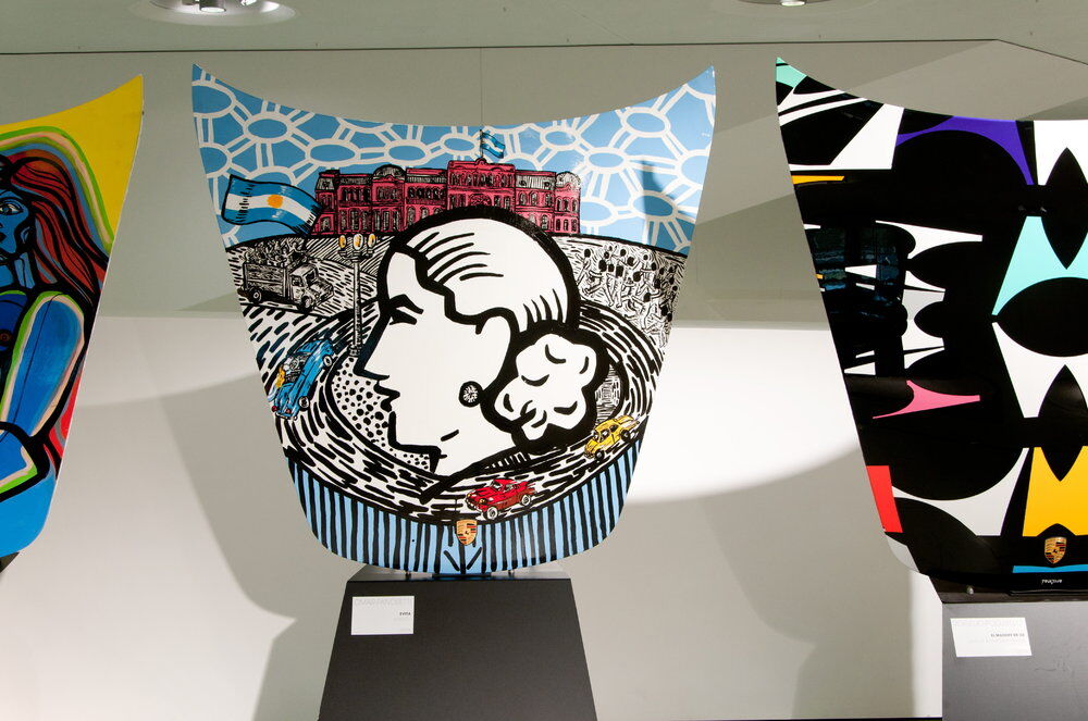 Pero estas obras de arte esconden una peculiaridad. En lugar de utilizar unos materiales convencionales como soporte, se ha recurrido a sendos capós de Porsche 911 GT2 para hacer las funciones de lienzo. El proyecto es una idea original del argentino Jorge Gómez.