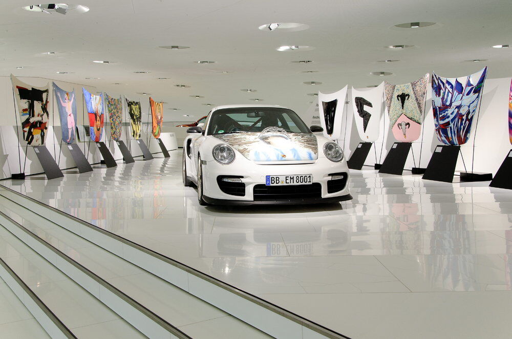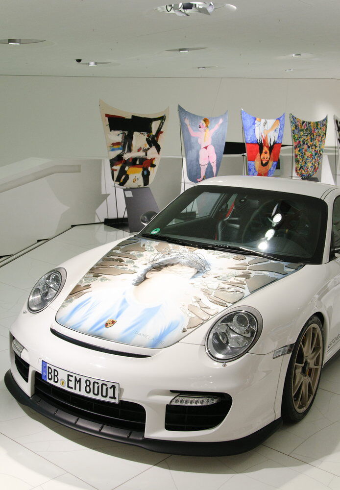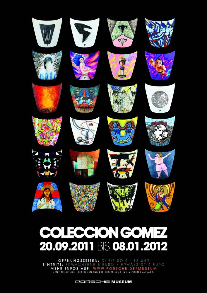 Pero de vez en cuando estas obras de arte vuelven a cumplir su función original como capó de un coche, pues Gómez en ocasiones los coloca en su propio Porsche 911 GT2 para dar una vuelta. La colección se han estrenado ahora en Europa, en el Museo Porsche de Stuttgart, y utiliza 23.000 CV como impresionante telón de fondo.