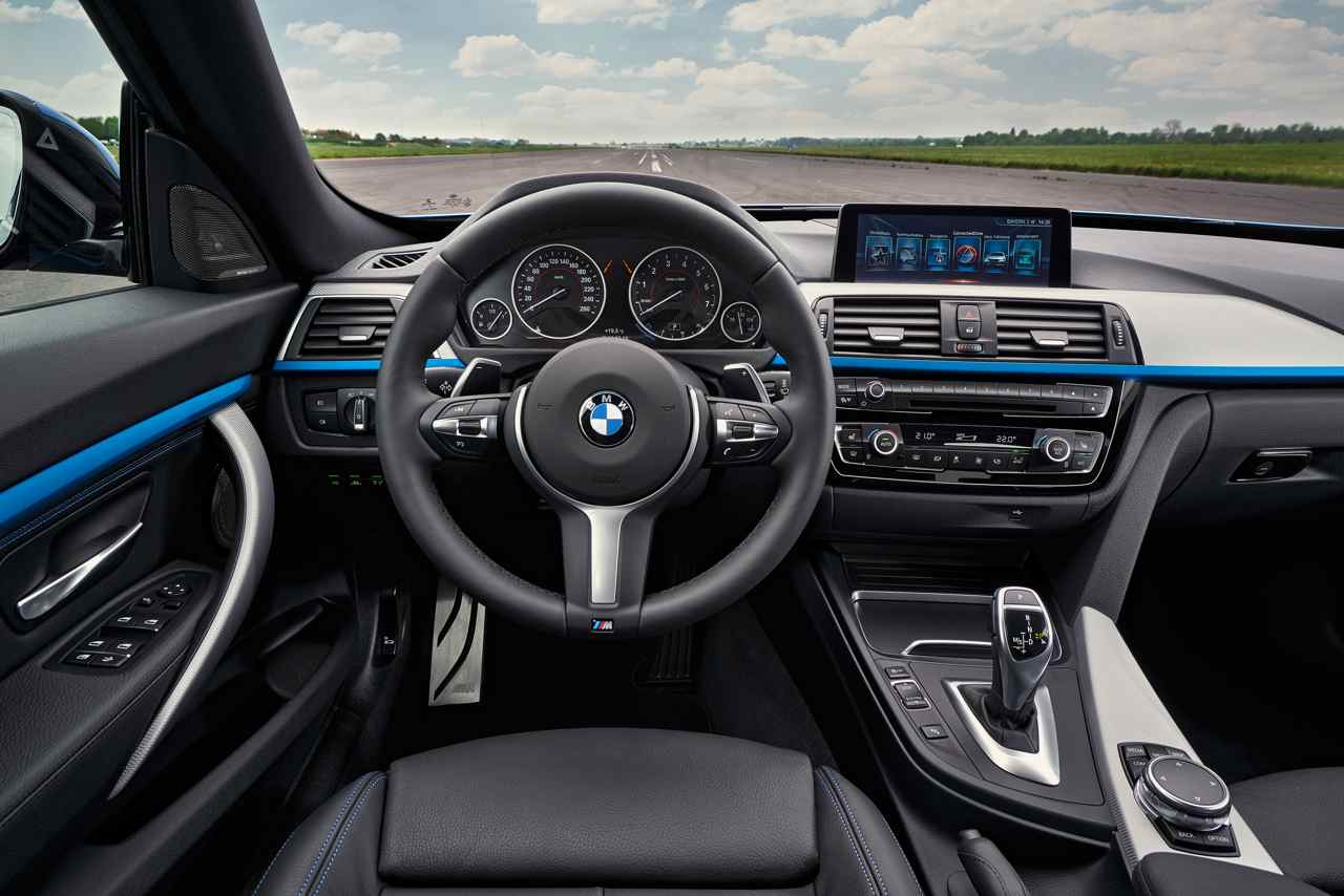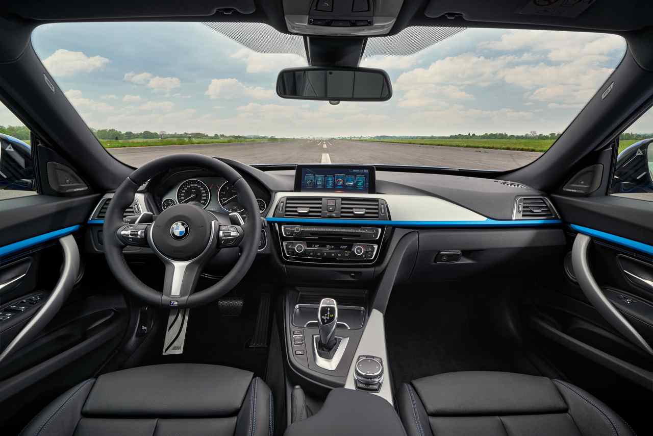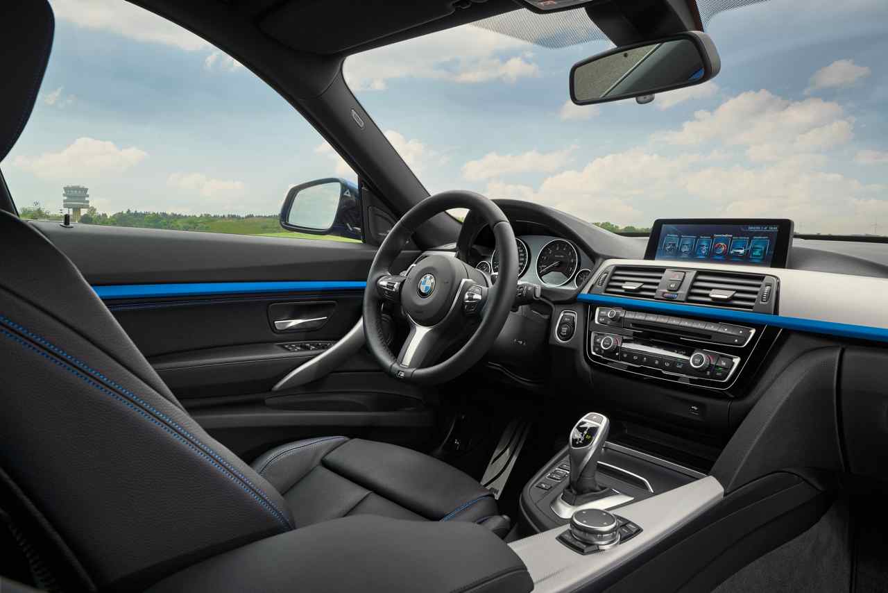 En el interior del BMW Serie 3 GT con acabado M Sport también se respira deportividad con detalles como las molduras de entrada M, el volante de cuero M o los reposapiés M. Y sobre todo con los asientos deportivos que se ofrecen de forma exclusiva en tela y Alcántara antracita con costura de contraste en color azul. Como variante a juego ideal para lucir el modelo M Sport se ofrece el equipamiento de cuero negro Dakota Schwarz con costura azul de contraste.