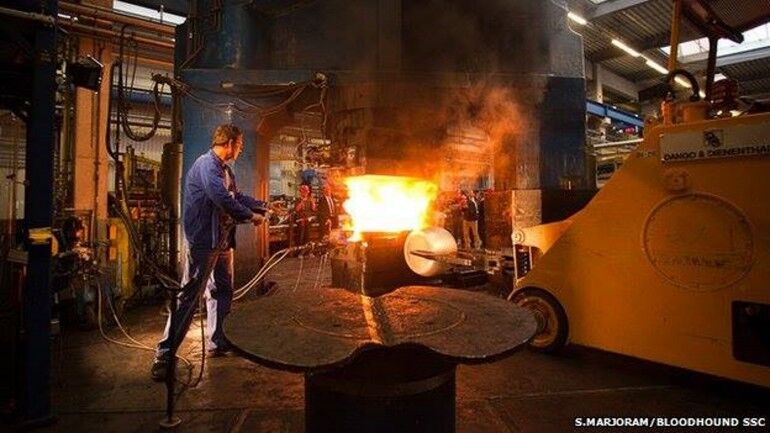 Para poder soportar tanta presión, los discos de ruedas del Bloodhound Supersonic Car están hechas de una aleación de aluminio especial creado para aplicaciones aeroespaciales, que incluye trazas de zinc, cobre y manganeso. Todo esto se forja en un horno donde es sometido a 3.6000 toneladas de prensado en caliente y 20.000 toneladas de prensado en frío.