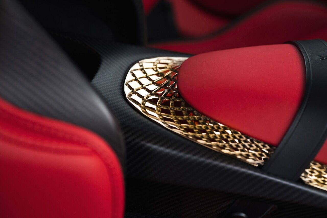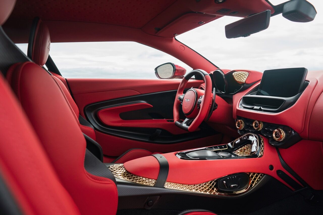 Las llantas de 21 pulgadas tienen un acabado hecho con oro de 18 quilates, un material que está presente también en otros puntos de este vehículo. Además, la impresión en 3D ha conseguido que puedan hacerse piezas totalmente personalizadas, que podrán seleccionarse a través del programa ‘Q by Aston Martin’. El motor de este DBS GT Zagato es el mismo V12 biturbo de 5.2 litros, aunque su potencia se ha elevado hasta los 760 CV y tendrá unas prestaciones mejoradas.