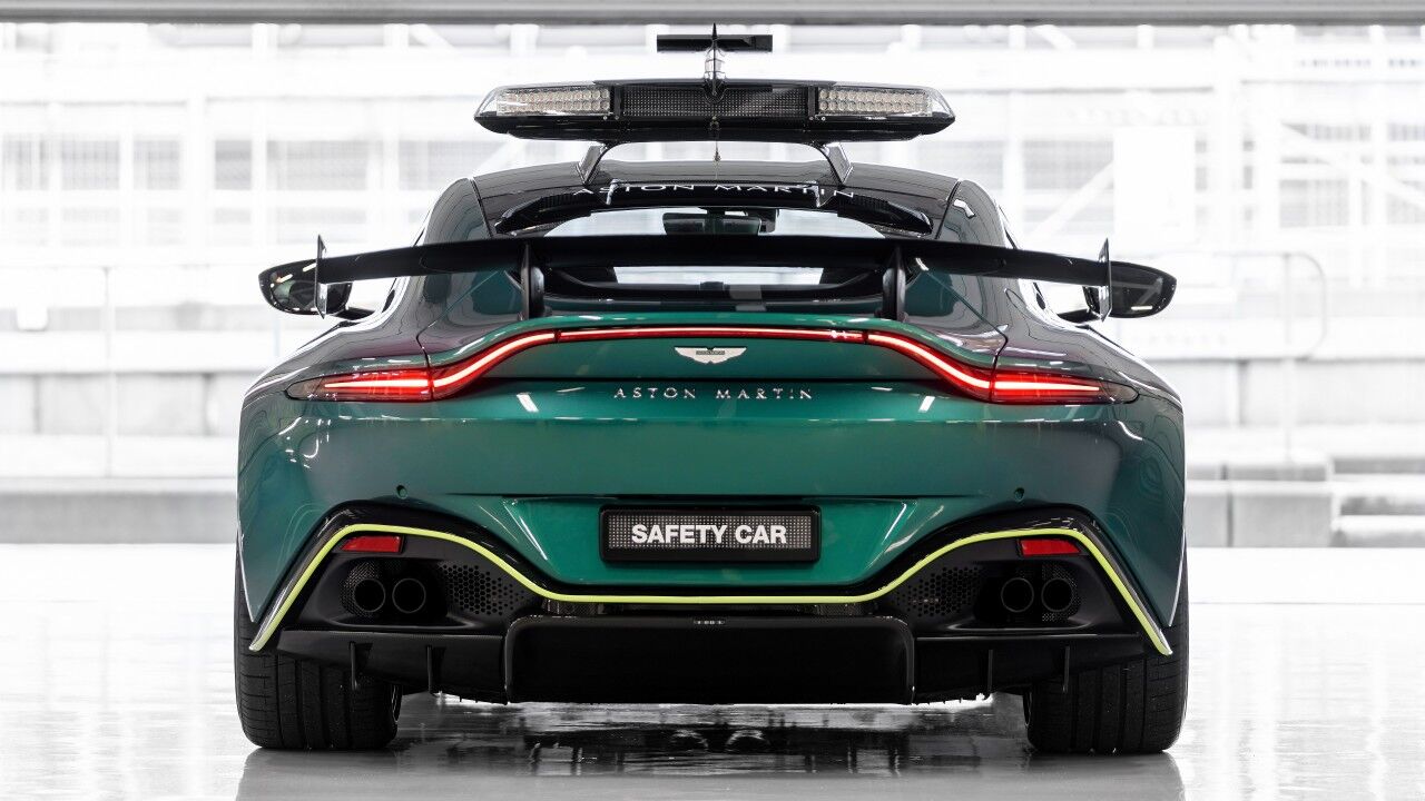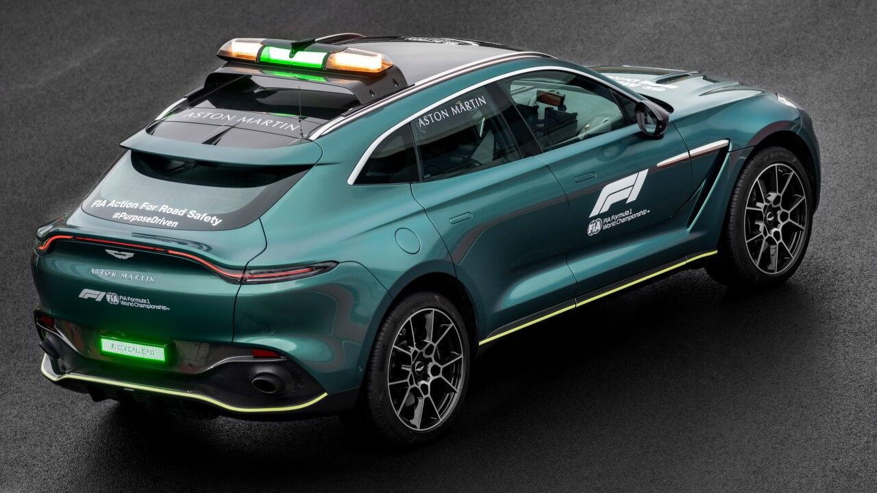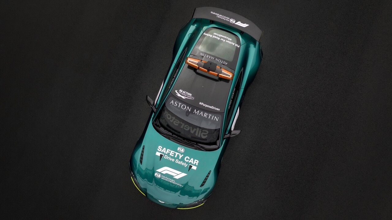 El Safety Car imita al monoplaza del equipo de carreras, con un tono completamente nuevo que se ha bautizado como “Aston Martin Racing Green 2021” y que se ha desarrollado en específico para celebrar el regreso de la marca a las carreras de Fórmula 1. La fina raya “Lime Essence” resalta el difusor frontal. El resto se distingue por la destacada decoración de coche de seguridad, que incluye antenas de radio montadas en el lateral de la carrocería, una placa de matrícula LED y una barra de luces a medida montada en el techo.