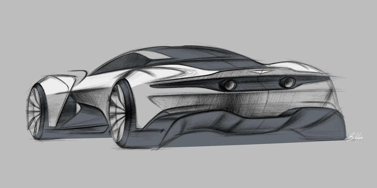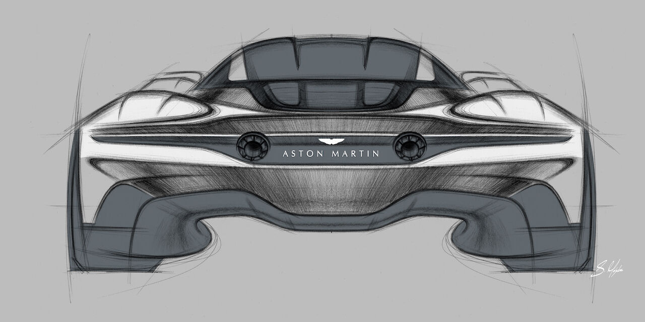 En ningún momento pretende ser tan técnico como el AM-RB 003, en este modelo se ha buscado un aspecto más seductor y menos centrado en las cifras. A pesar de ello, los parecidos son obvios y aparece un frontal muy bajo con unos faros minimalistas y un splitter prominente. La silueta es realmente curvilínea y destacan esos abombados pasos de rueda. La zaga es muy minimalista, deja una tapa a través de la cuál se verá el motor, unos escapes integrados en la zona media (en línea con los pilotos) y un difusor trasero en la parte inferior.