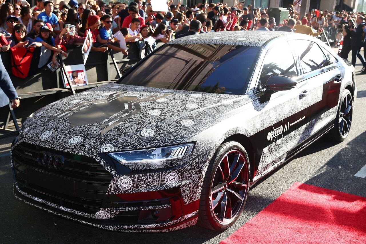Junto a Tom Holland, actor que encarna a Spiderman, y las otras estrellas de la película, el nuevo A8 se camufló para la ocasión con sus mejores galas. En lugar de la fina cubierta adhesiva especial que el equipo de desarrollo de Audi coloca habitualmente sobre todo el coche para ocultar en lo posible las formas del mismo antes de su lanzamiento, para esta ocasión especial se cambió el tradicional diseño con formas de remolino en blanco y negro por otro que incorporaba telas de araña en las puertas del vehículo y en el interior de los cuatro aros del logo de la marca elaborado para la ocasión por Audi Design.