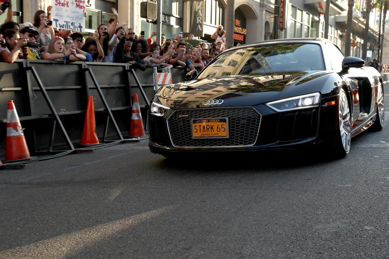 Los actores Robert Downey Jr y Jon Favreau, protagonistas habituales de las películas de Iron Man, llegaron a la gala juntos al volante de un Audi R8 Spyder de color negro.