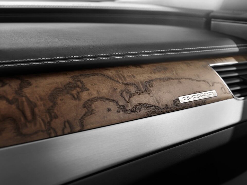 El Audi A8 exclusive concept cuenta con un interior que rebosa elegancia. Audi utiliza cuero en color Agatha Cognac. Avalada por la tradición del diseñador italiano fabricante de muebles de lujo Poltrona Frau, esta piel es particularmente suave al tacto y cuenta con un aspecto muy natural. Las secciones centrales de los asientos cuentan con acolchado en forma de diamantes, y las inserciones decorativas en el interior están realizadas en madera de olivo de grano fino en color marrón plateado, que armoniza con el color utilizado en las costuras, los ribetes y el pliegue central de los asientos.