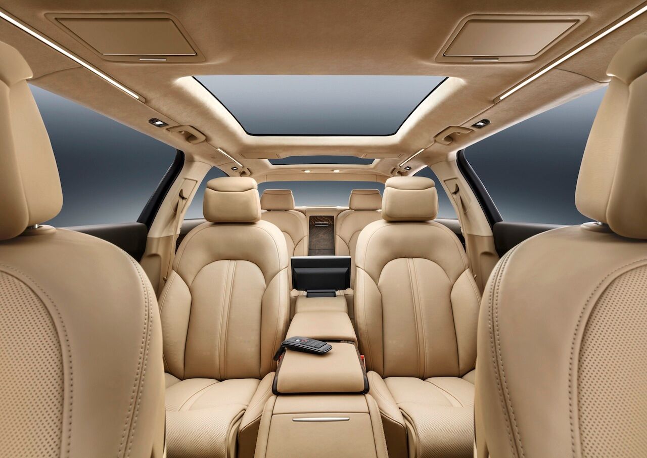 El habitáculo es excepcional y, como hay un panel de cristal de 2,40 metros en el techo, aumenta la sensación de espacio (con cortinillas en cada fila de asientos). Los ocupantes de las dos filas traseras irán en unos butacones individuales tapizados de cuero Valcona, todos con ajustes eléctricos. En la fila posterior hay una consola central continua, pantallas para el sistema de entretenimiento y un receptáculo refrigerado.