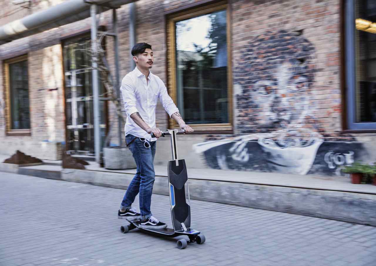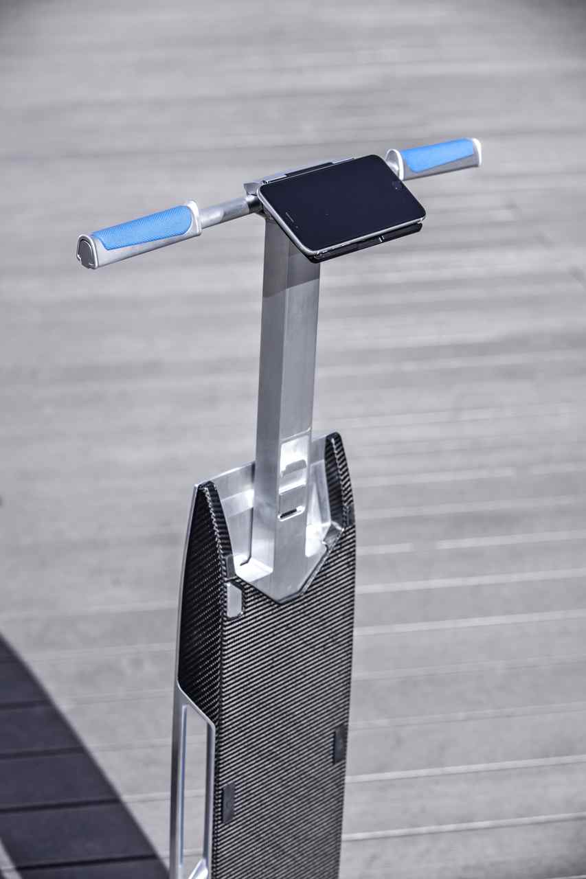 - Scooter mode: el teléfono va anclado al manillar desplegable para mostrar direcciones y la velocidad se ajusta con un control remoto dispuesto en el puño derecho del manillar, donde puede sujetarse una mochila.
