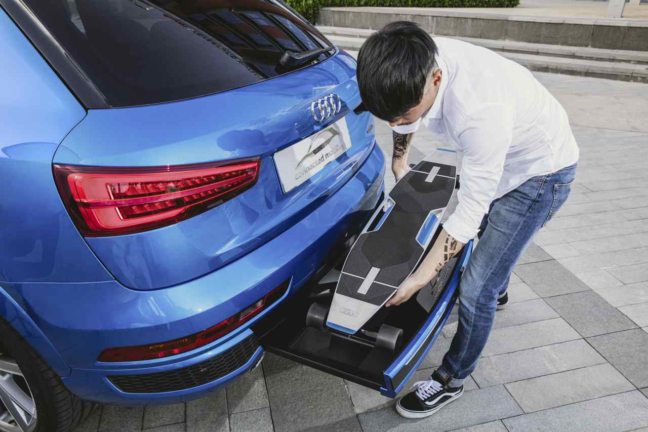 Basado en el Audi Q3, que los de Inglostadt fabrican también en China y donde es el SUV premium más vendido, se ha fabricado este prototipo que pretende ser una solución de movilidad combinada para zonas urbanas. El Audi connected mobility concept pretende acercar a la gente a su destino final, allí donde los coches no pueden llegar, debido a las restricciones de circulación... o la falta de aparcamiento cercano.