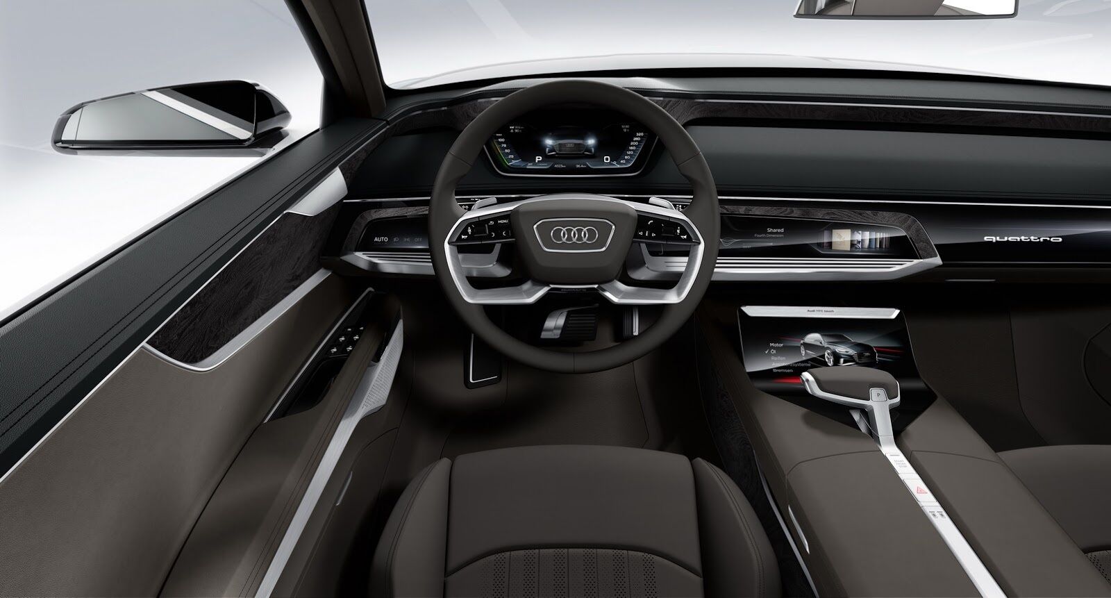 El interior da un salto tecnológico respecto a lo que estamos acostumbrados a ver. Cuenta con tres pantallas táctiles en el salpicadero y dos pantallas OLED situadas en la parte trasera, que sirven para enviar información al sistema multimedia o al navegador, controlar el climatizador o ajustar los asientos. Este sistema es la evolución del Audi Tablet que incorporará el nuevo Audi Q7 2015.