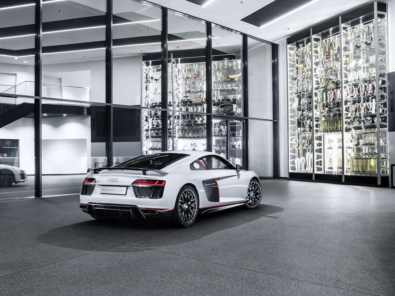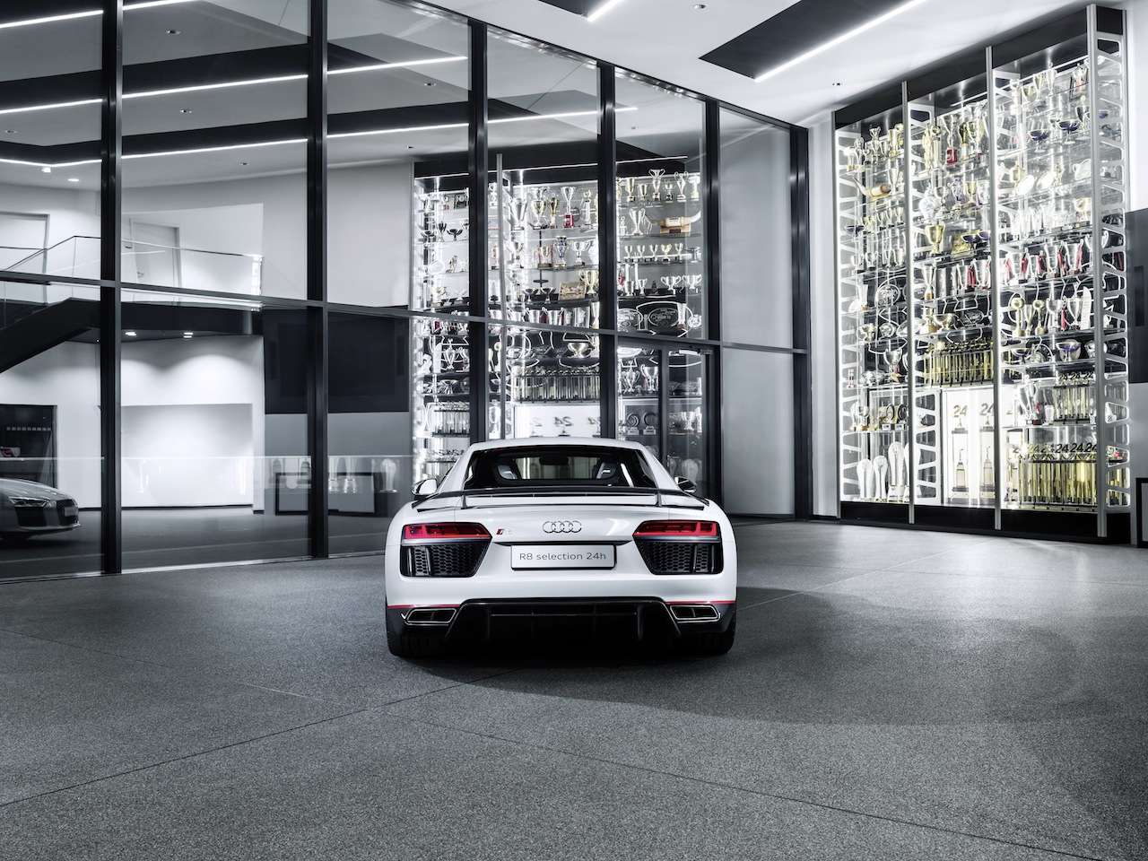 El Audi R8 V10 plus selection 24h añade a la versión de serie la dirección dinámica, el sistema de control adaptativo de la amortiguación Audi magnetic ride y los faros láser de Audi. Imita al coche de competición en el color de la carrocería, combinando el gris con negro y rojo. Las salidas del sistema de escape deportivo están acabadas en negro y las llantas de 20 pulgadas de aluminio forjado y diseño de 10 radios en Y, pintadas en color negro antracita brillante.