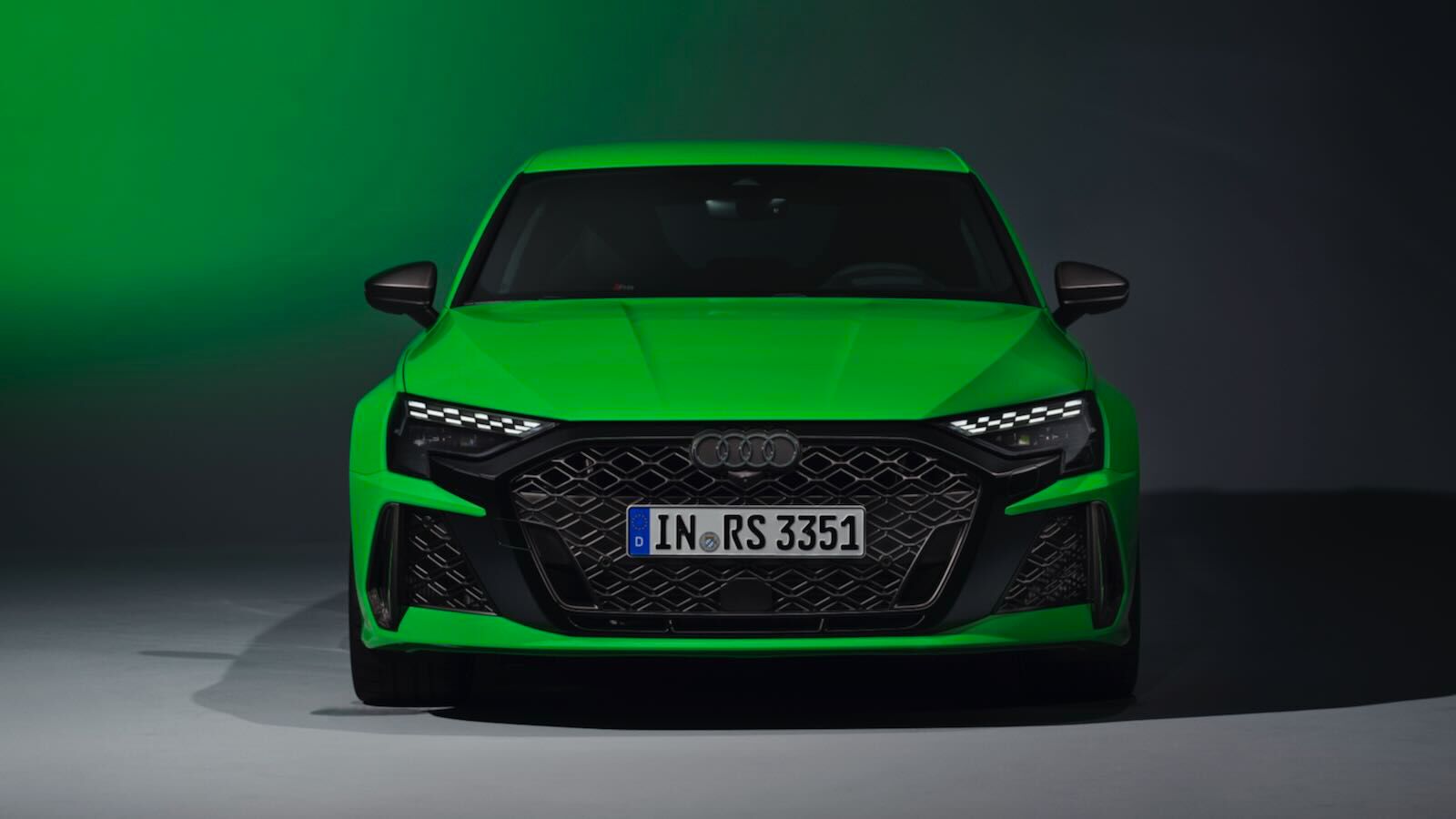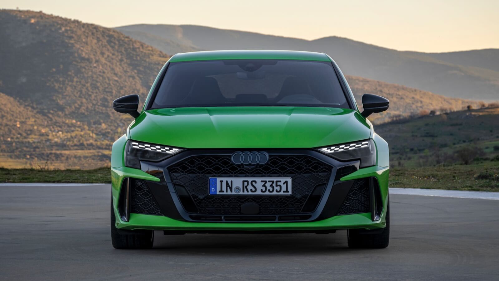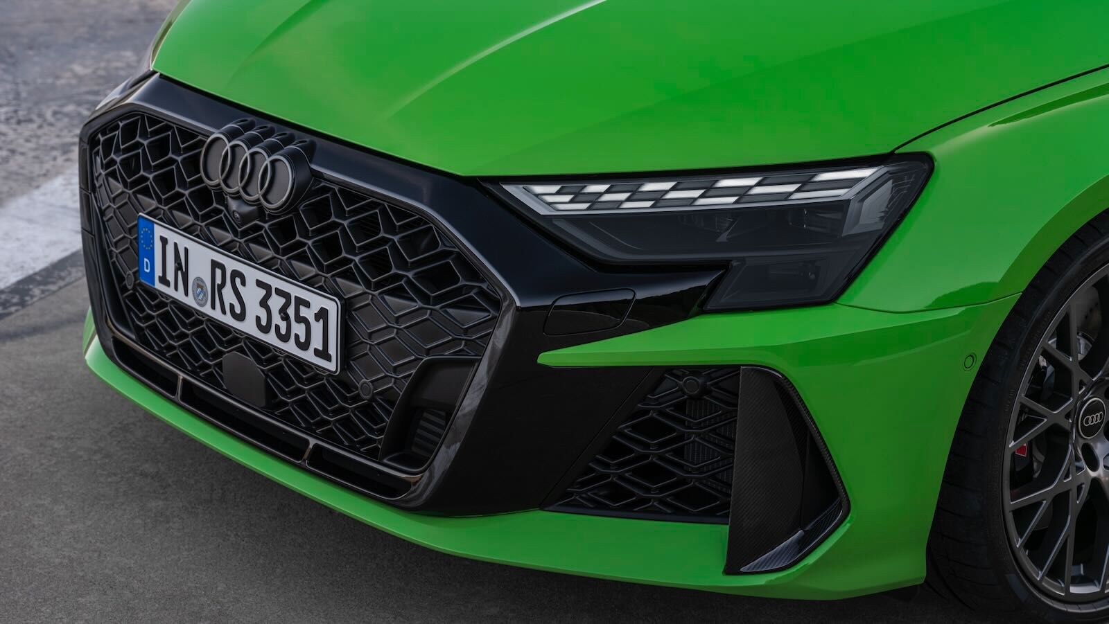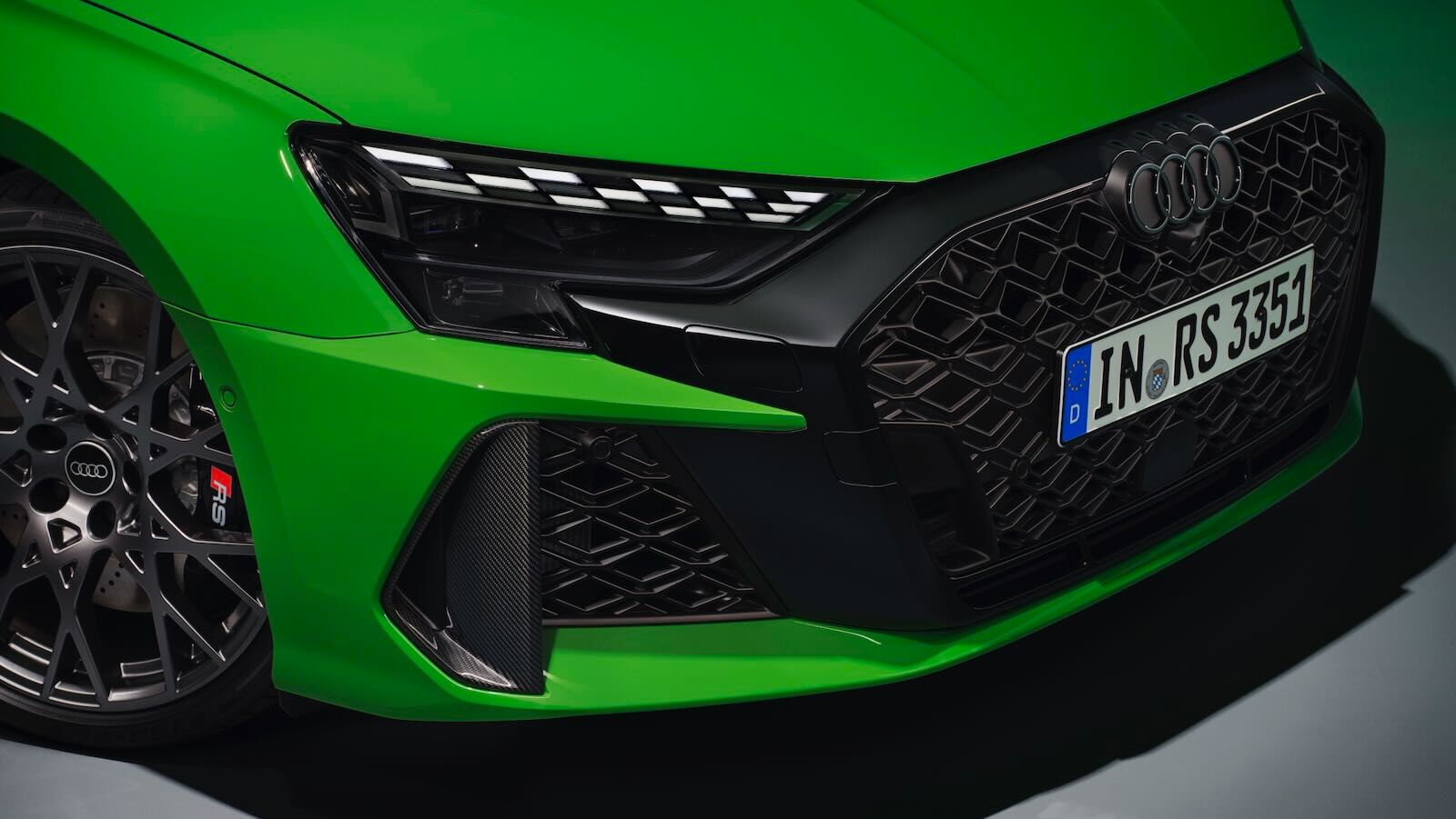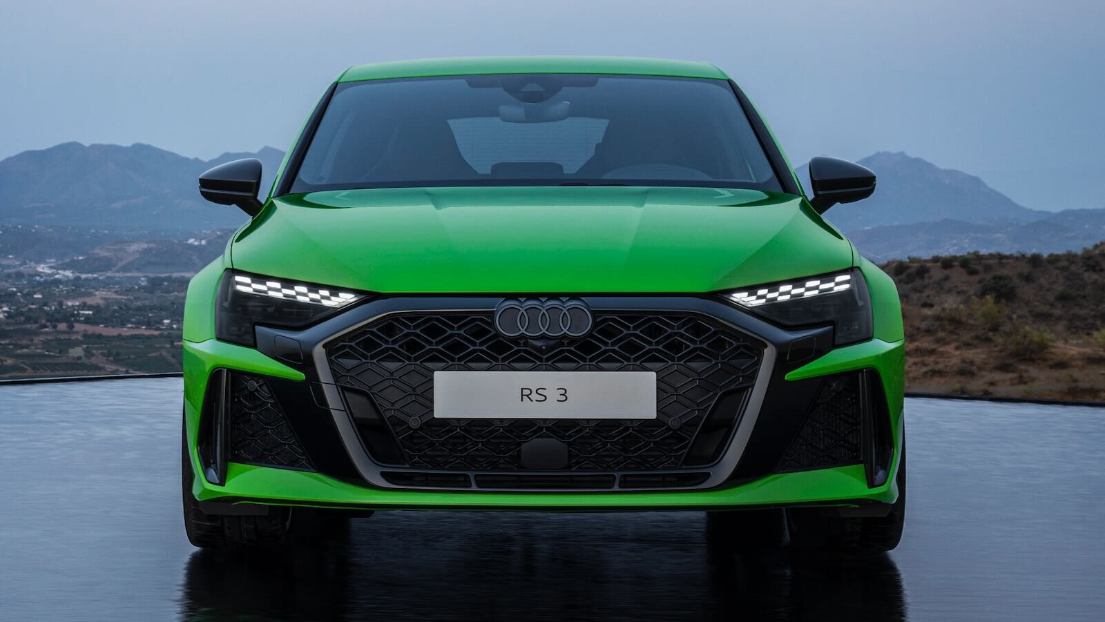 En el apartado estético, el nuevo Audi RS 3 Sportback gana deportividad. En el frontal domina el Singleframe hexagonal, más plano y ancho, con una voluminosa parrilla con patrón de rombos. Las tomas de aire laterales resaltadas por lamas negras verticales y las tres aberturas sobre el splitter delantero hace que parezca más bajo. Cambian sus luces diurnas, con una firma digital que muestra una bandera a cuadros... si bien al elegir los faros matrix LED (inéditos en el RS 3) se pueden elegir entre tres diseños adicionales, algo que vimos en el Audi Q4 e-tron.