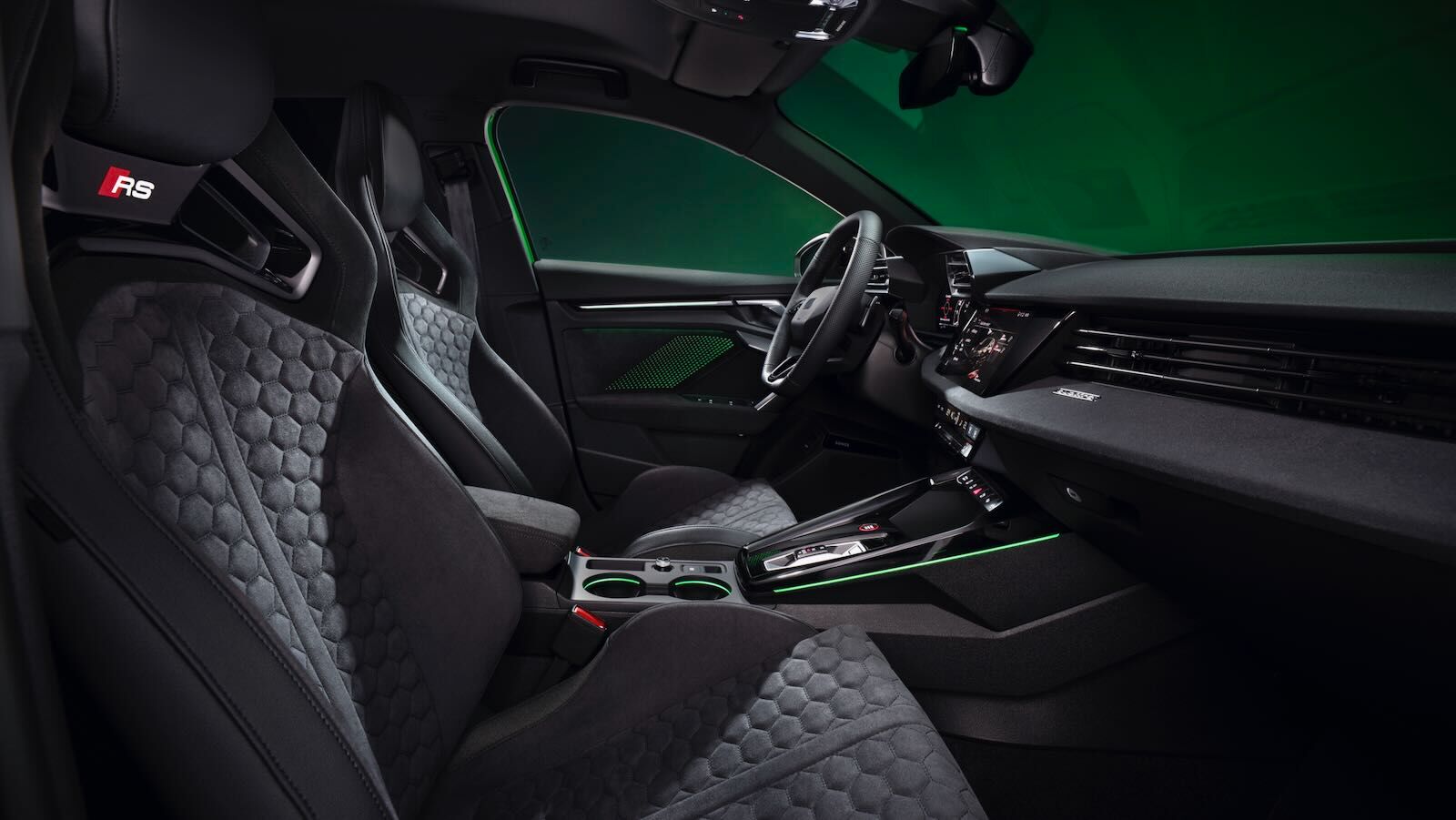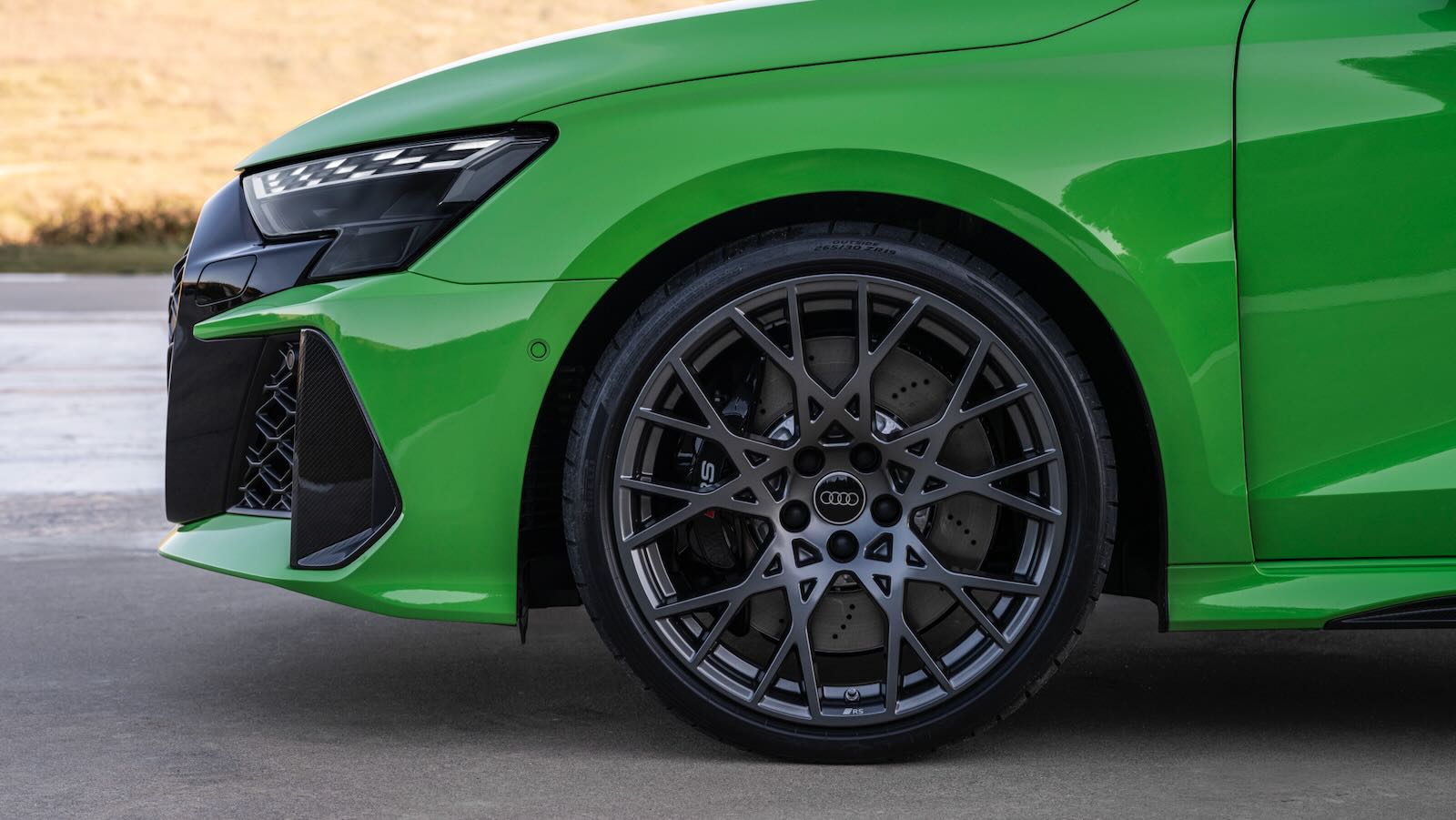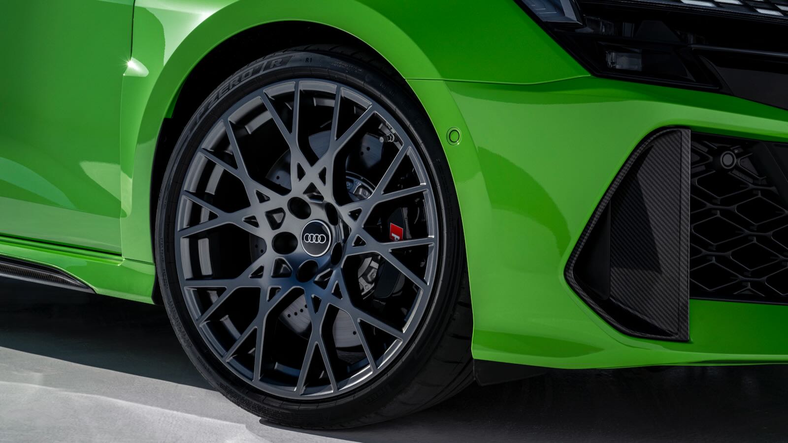 De serie tiene llantas de aluminio de 19 pulgadas en negro mate con un diseño de 5 radios en Y. Como opción hay un diseño que recuerda a la edición RS 3 performance, con diez radios en cruz y acabadas en gris oscuro mate o en negro metalizado. Por cierto, los neumáticos semi-slick Pirelli P Zero Trofeo R están disponibles como opción. También hay paquetes de carbono y negro de alto brillo para personalizar el coche, con carcasas de los retrovisores en color de la carrocería, negro o carbono.
